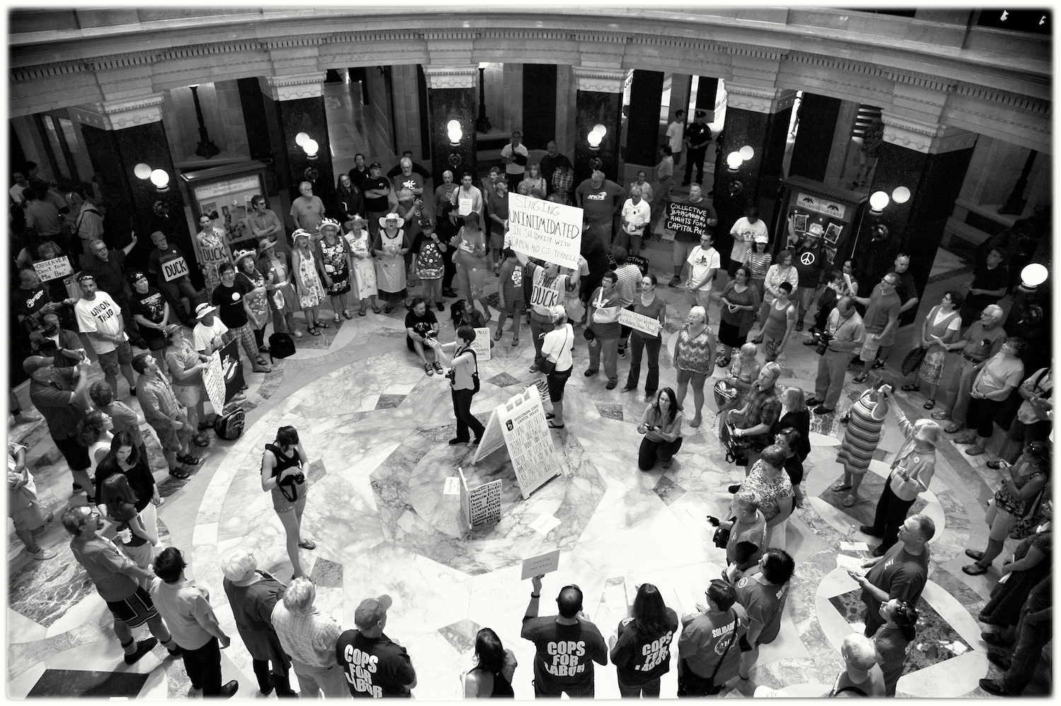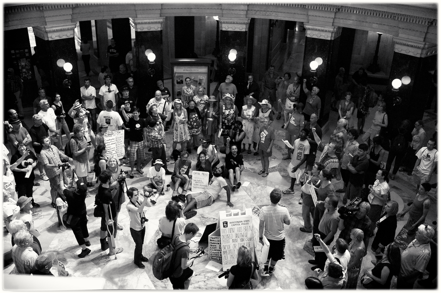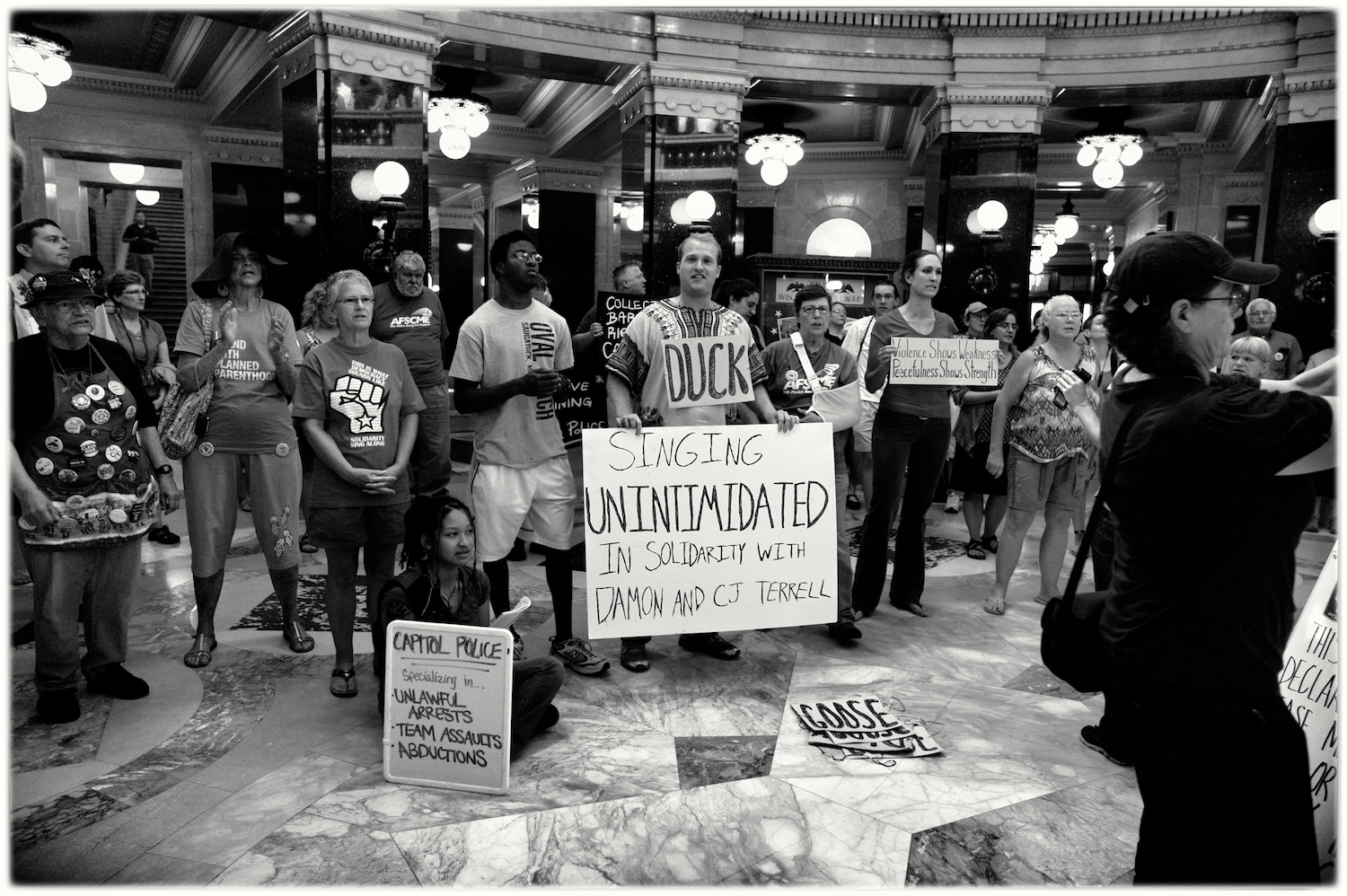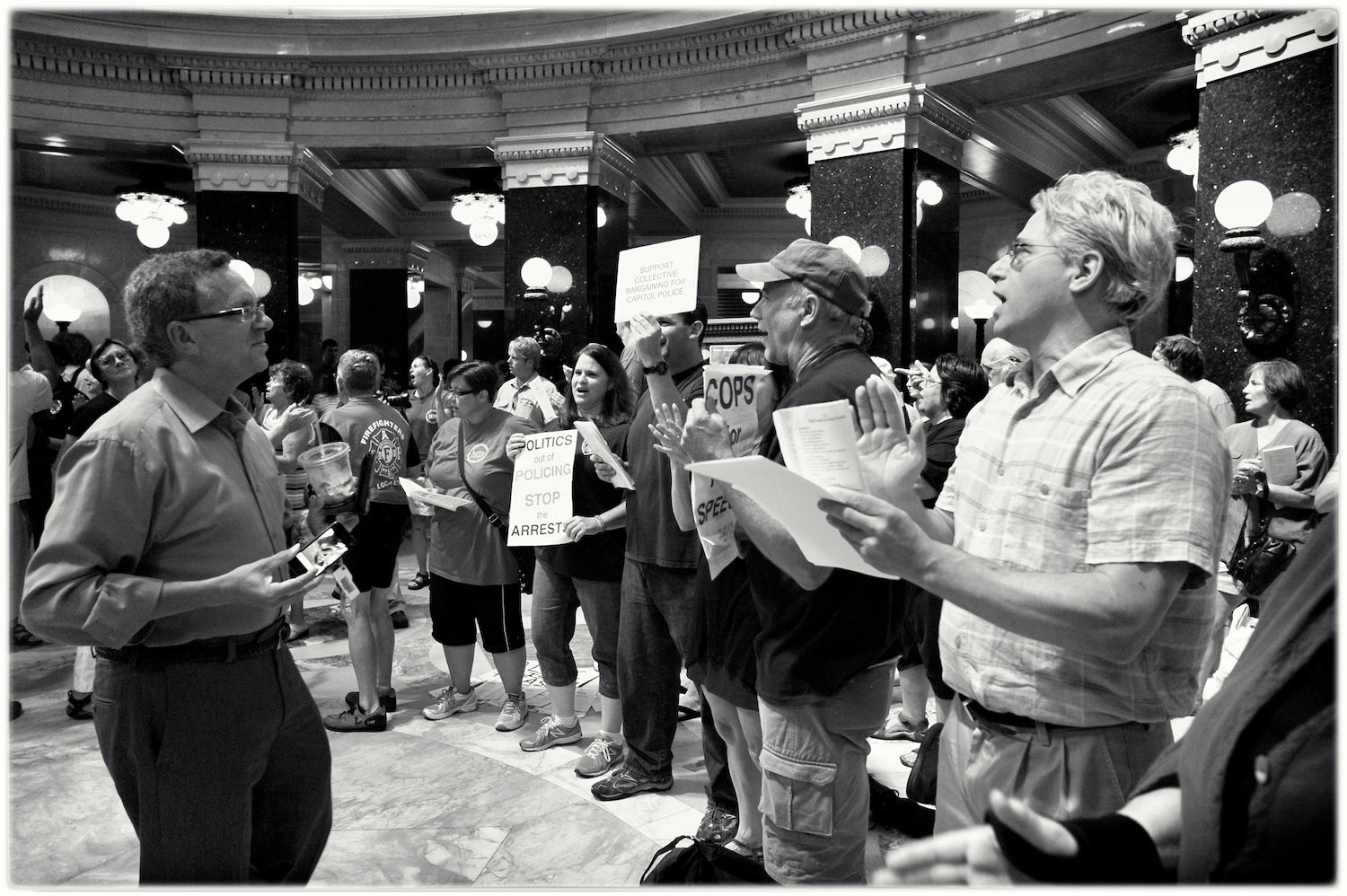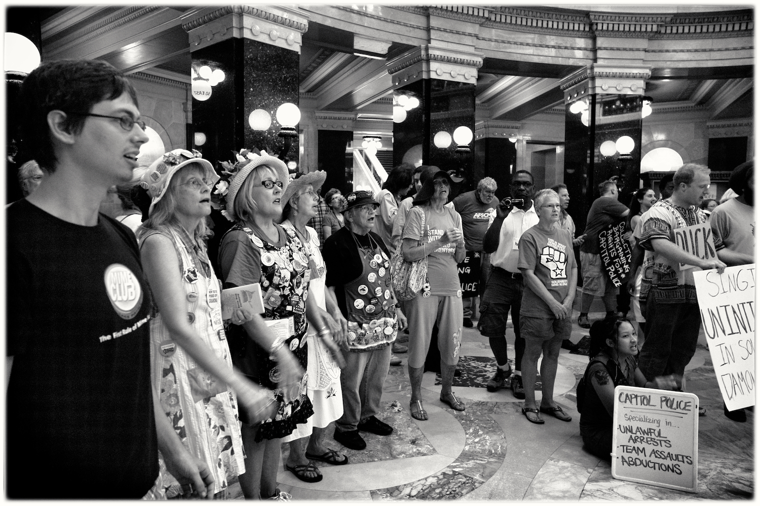 Spent some time at the Wisconsin State Capital today for the Solidarity Sing Along (a group of folks who have been meeting at noon everyday to sing protest songs in response to the draconian ways of the governor and republican party). Recently, these sing-along’s have been invaded by the Capital Police who, under orders, have been arresting participants because this gathering has been determined unlawful. In the hour I was there today 3 or 4 people were arrested. The rest of the time in an act of intimidation, the police circled the outer hall around the rotunda looking for others to arrest.