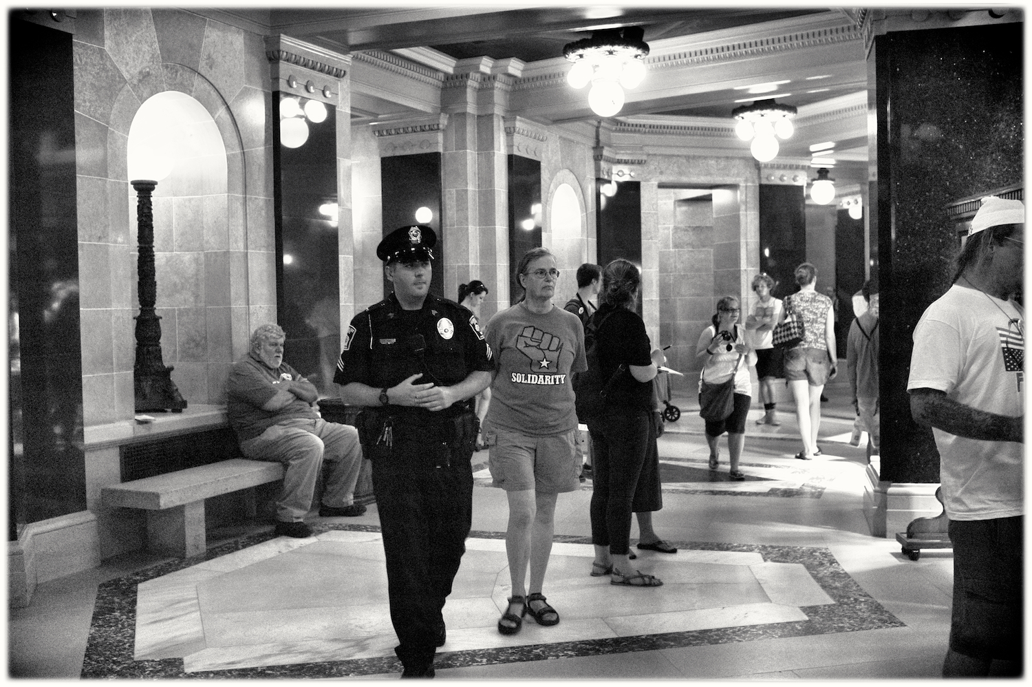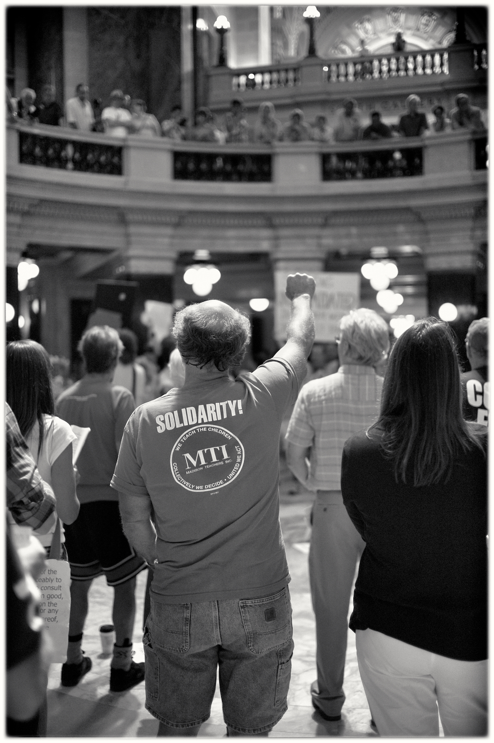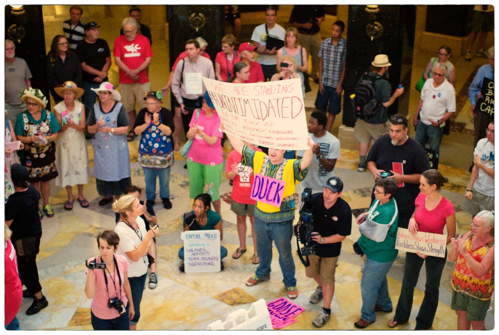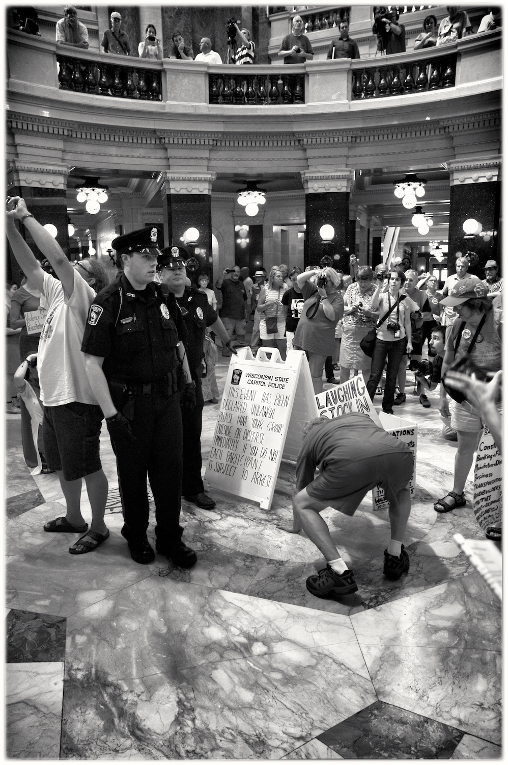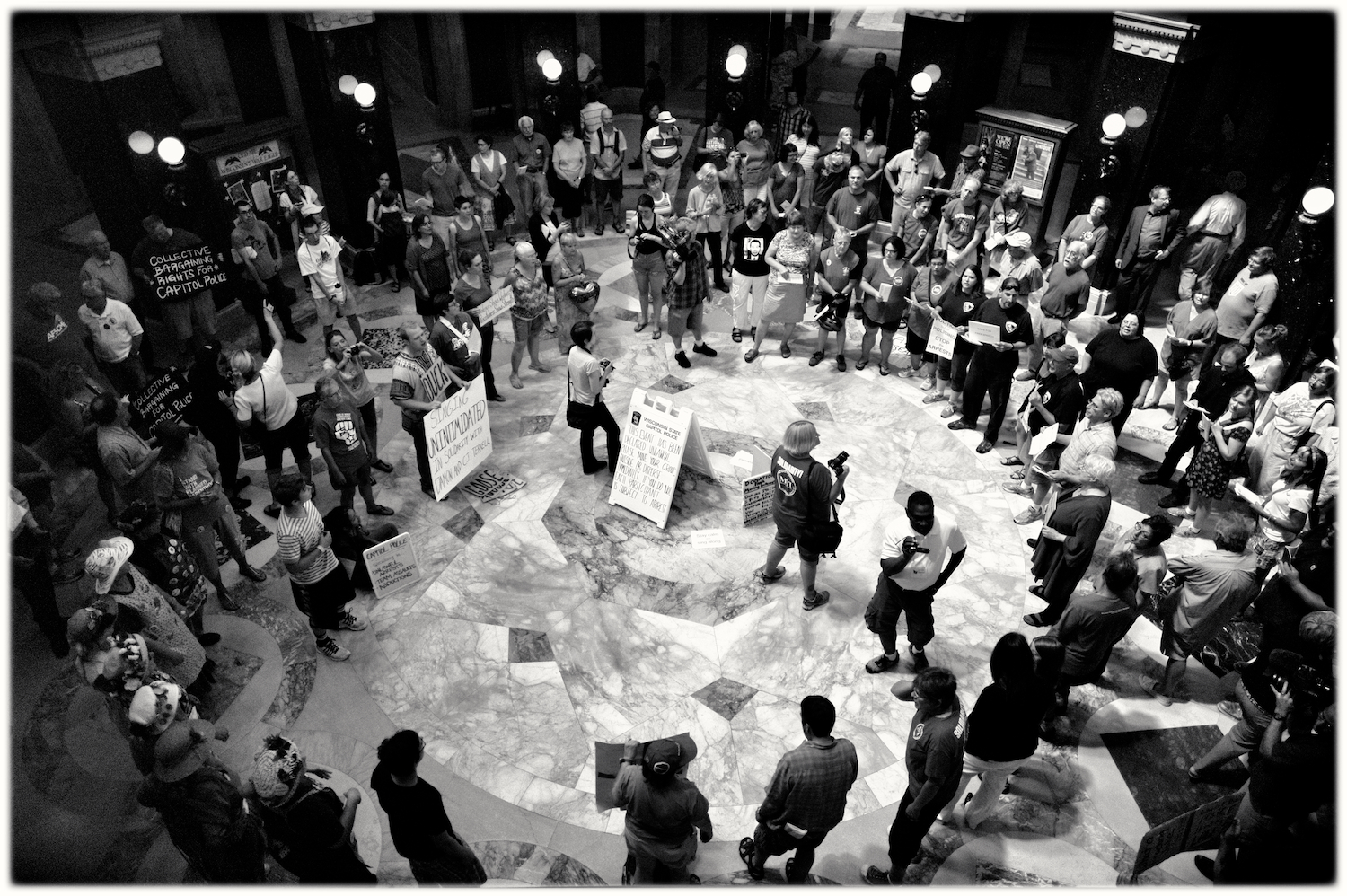Spent some time at the Wisconsin State Capital today for the Solidarity Sing Along (a group of folks who have been meeting at noon everyday to sing protest songs in response to the draconian ways of the governor and republican party). Recently, these sing-along’s have been invaded by the Capital Police who, under orders, have been arresting participants because this gathering has been determined unlawful. In the hour I was there today 3 or 4 people were arrested. The rest of the time in an act of intimidation, the police circled the outer hall around the rotunda looking for others to arrest.