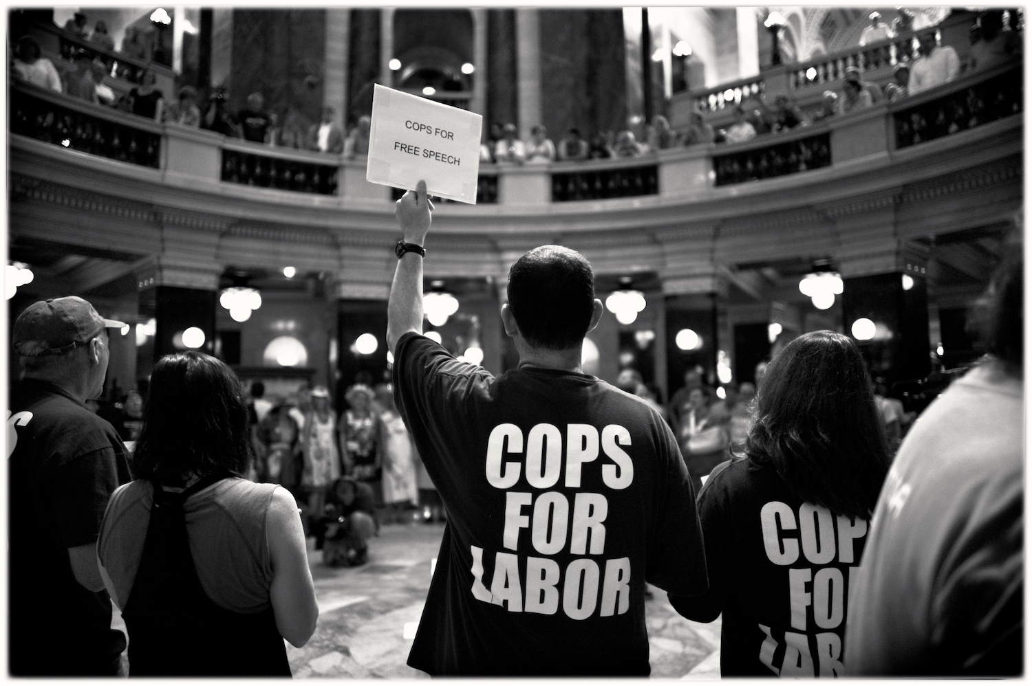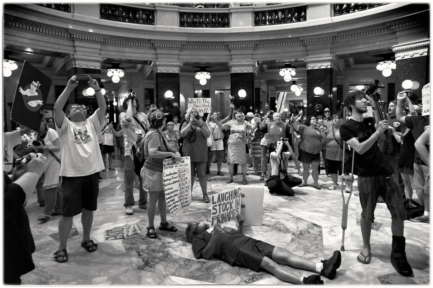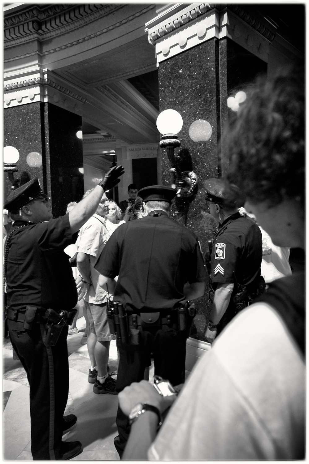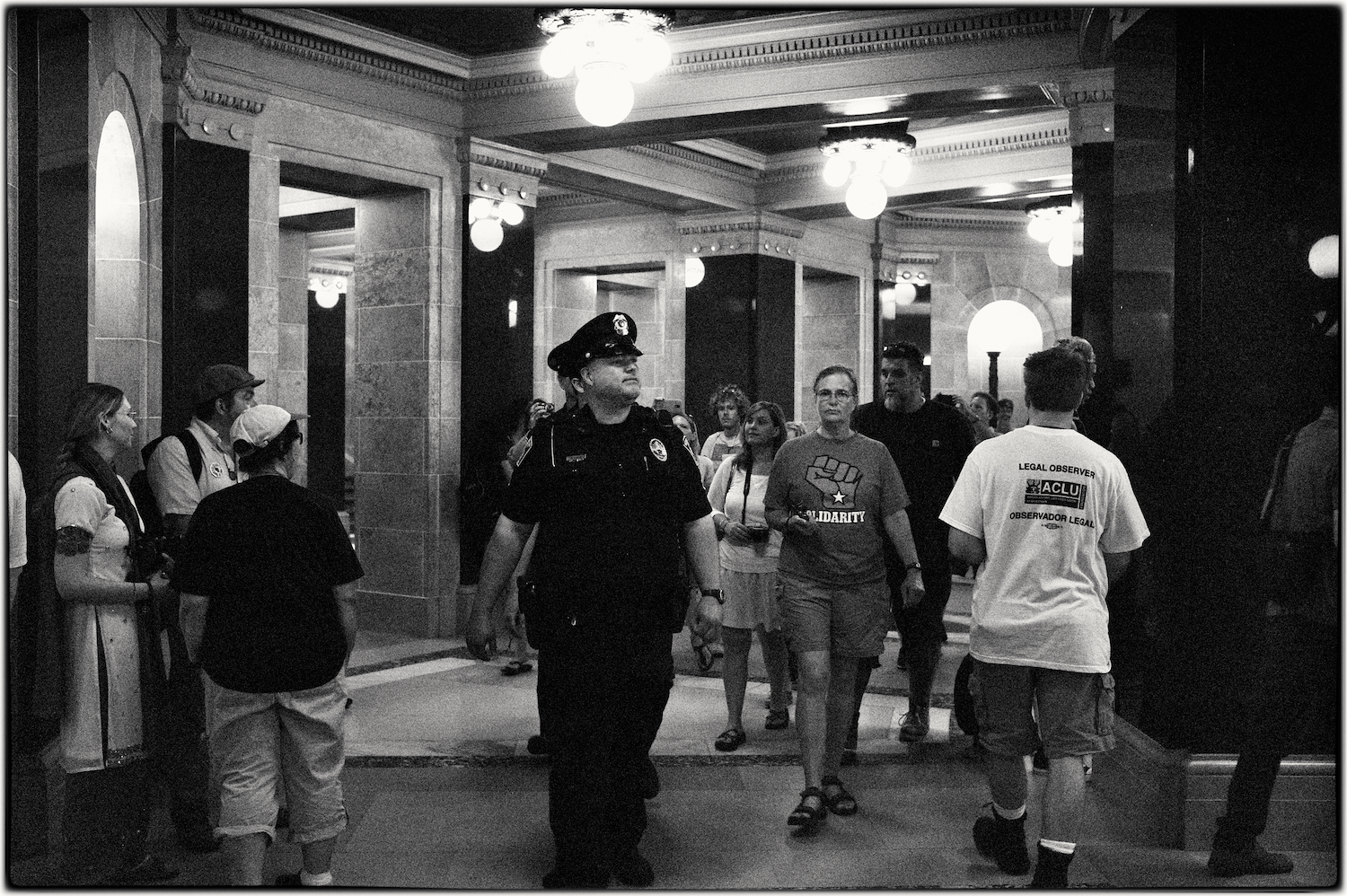 Spent some time at the Wisconsin State Capital today for the Solidarity Sing Along (a group of folks who have been meeting at noon everyday to sing protest songs in response to the draconian ways of the governor and republican party). Recently, these sing-along’s have been invaded by the Capital Police who, under orders, have been arresting participants because this gathering has been determined unlawful. In the hour I was there today 3 or 4 people were arrested. The rest of the time in an act of intimidation, the police circled the outer hall around the rotunda looking for others to arrest.