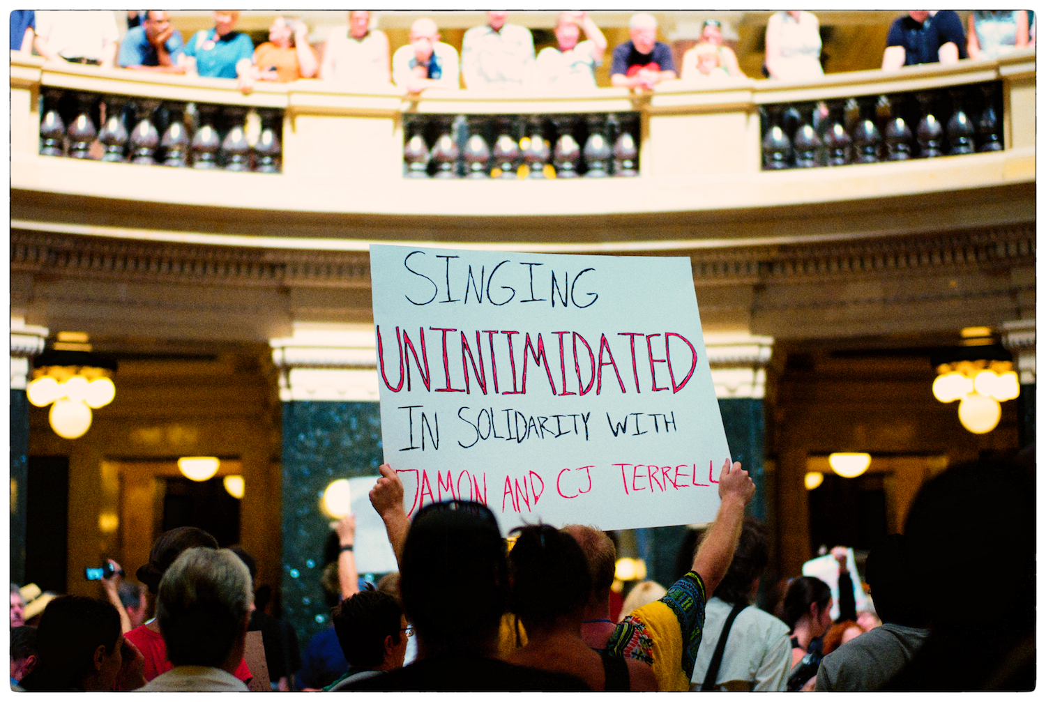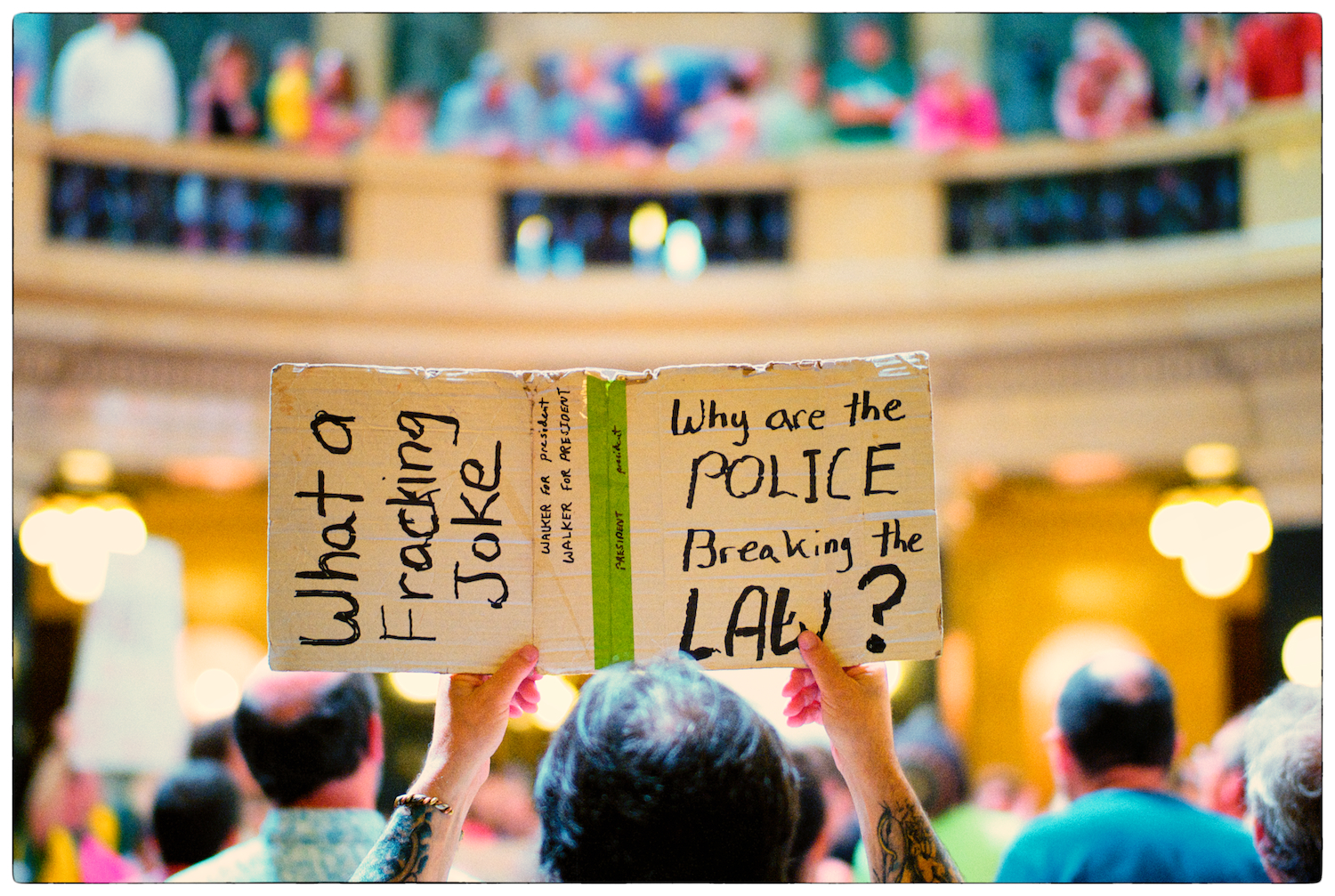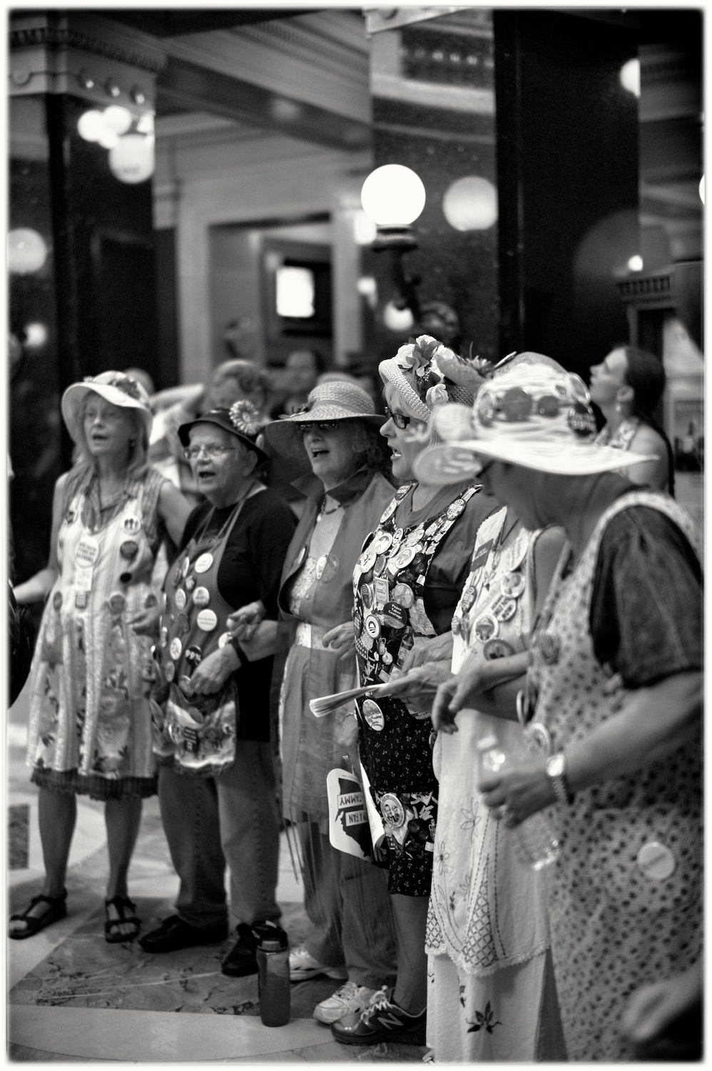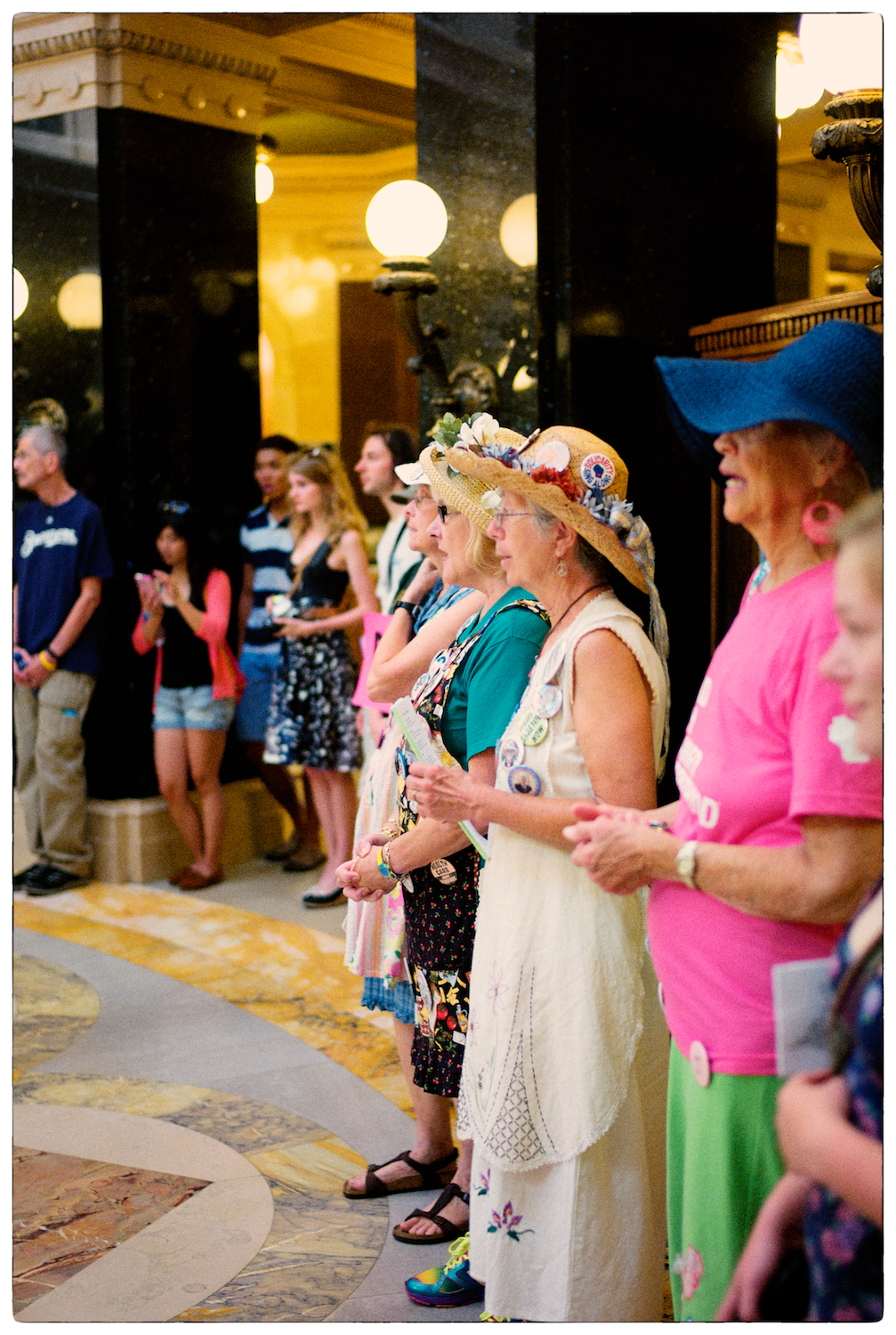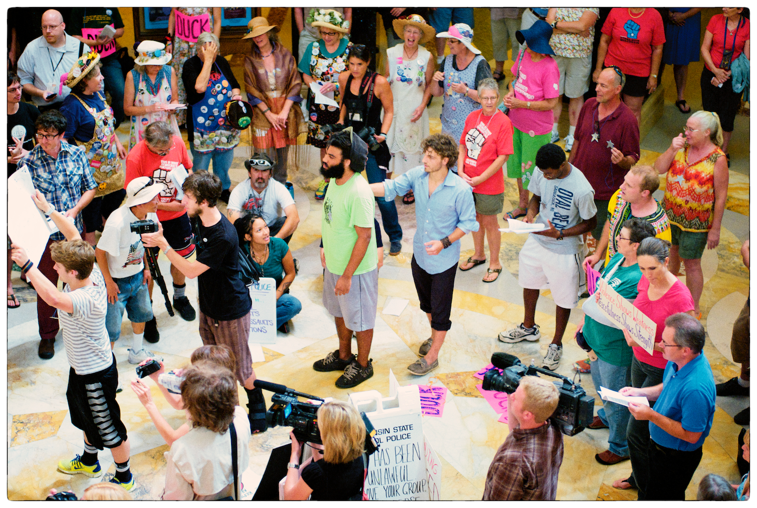 Spent some time at the Wisconsin State Capital today for the Solidarity Sing Along (a group of folks who have been meeting at noon everyday to sing protest songs in response to the draconian ways of the governor and republican party). Recently, these sing-along’s have been invaded by the Capital Police who, under orders, have been arresting participants because this gathering has been determined unlawful. In the hour I was there today 3 or 4 people were arrested. The rest of the time in an act of intimidation, the police circled the outer hall around the rotunda looking for others to arrest.