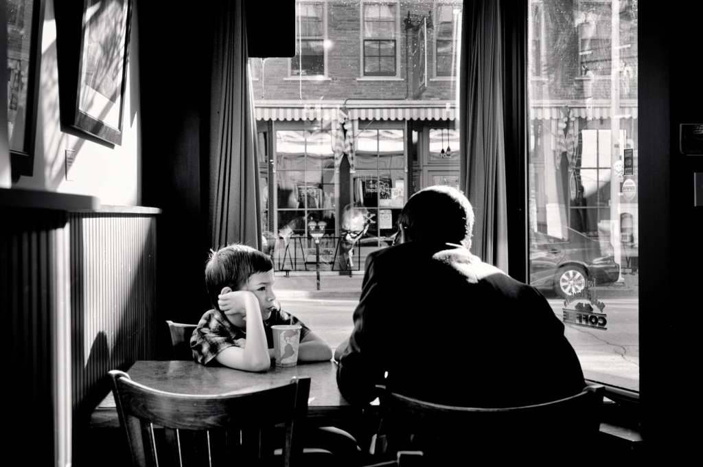 This picture was taken at Jitterz Coffee Shop in Dubuque, Iowa. As Michael sat, sipping coffee, he looked up and saw this Rockwellian scene. Instinctively, Michael raised his camera to capture this ephemeral moment.