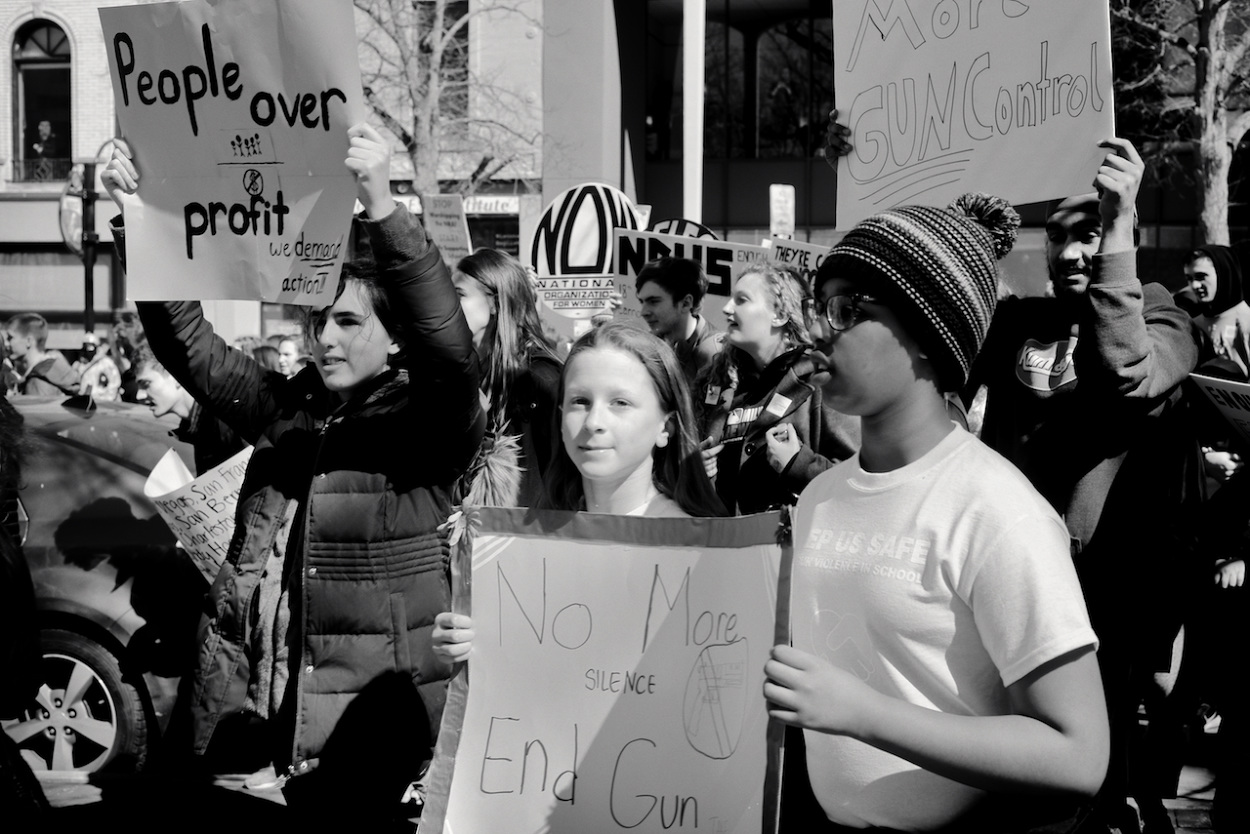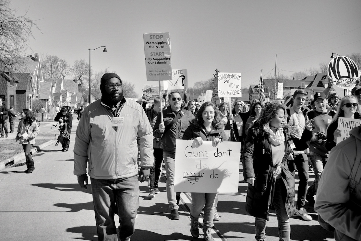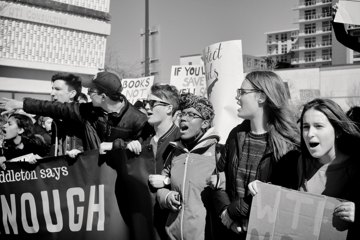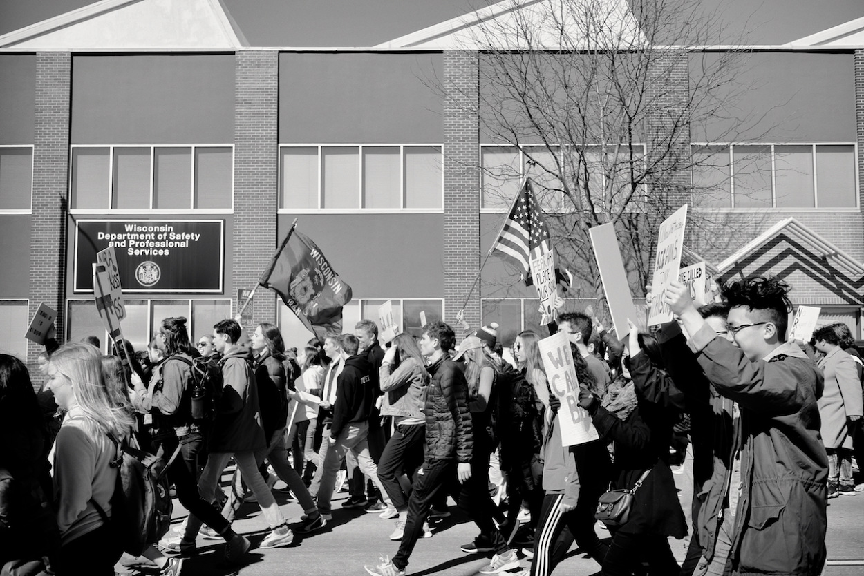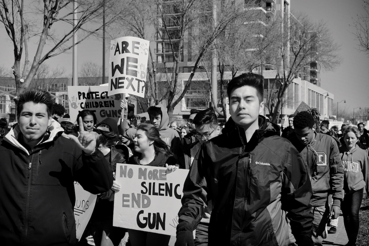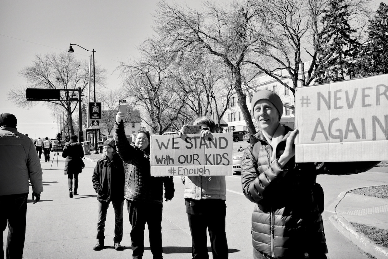 I stepped off the bus and saw the throng of students that had amassed at East High School. Police were directing traffic. Onlookers were cheering in support of the students. And everyone seemed to have a cell phone recording the event. I wandered around snapping pictures and taking in the scene. The crowd continued to swell and soon it was time to go. At once they formed a front line and moved forward down East Washington street towards the Capital. An estimated 3000 students marched from East High School to the Wisconsin State Capital building to meet up with students from the University of Wisconsin Madison and others. Along the way they chanted, “HEY, HEY, HO, HO, THE NRA HAVE GOT TO GO!”and “THIS IS WHAT DEMOCRACY LOOKS LIKE!” and “ARE WE NEXT?” Their signs shown brightly in the midday sun, telling the world how they were feeling and that they would not be ignored and were not going away.