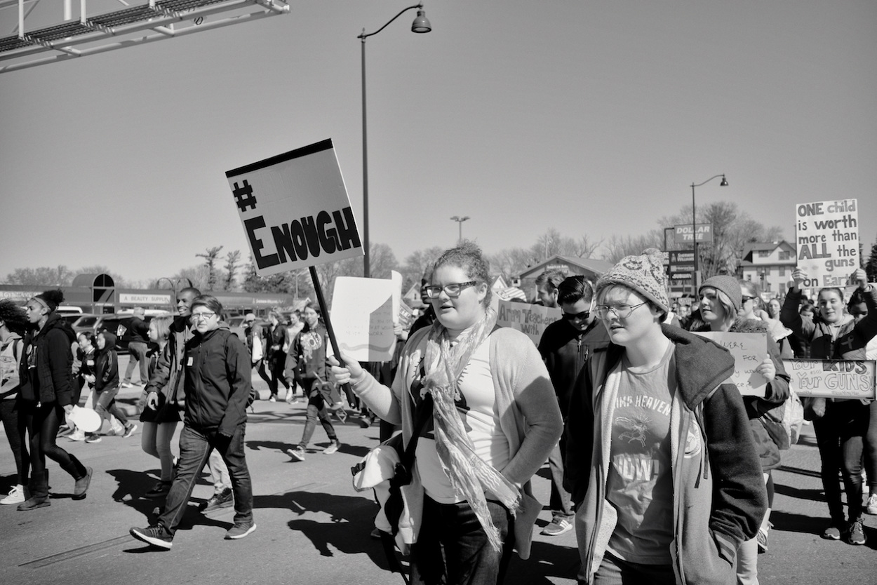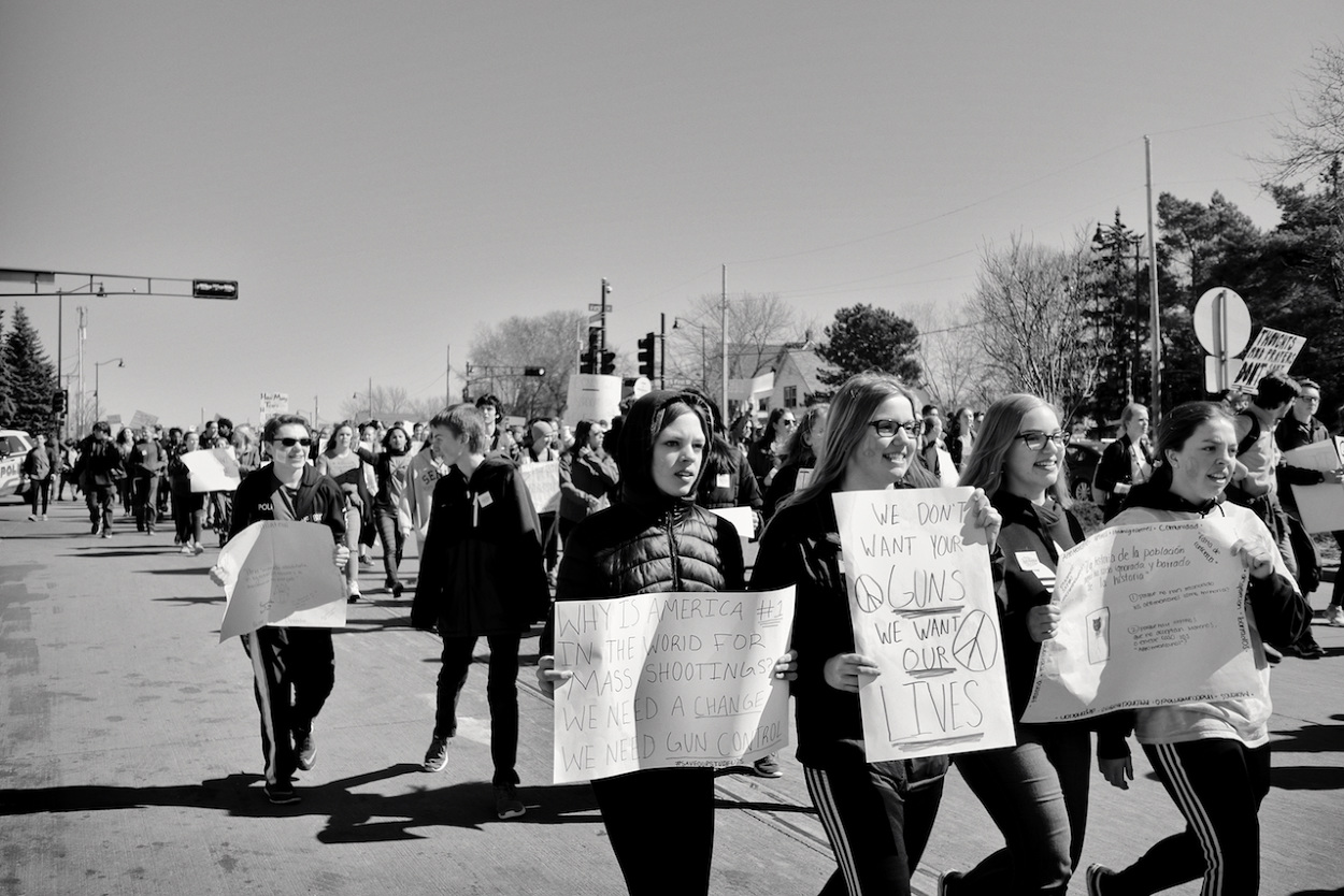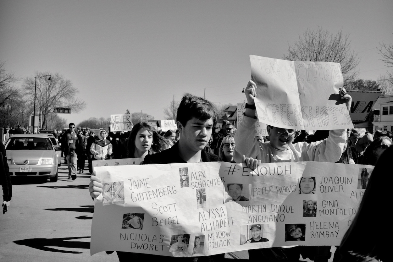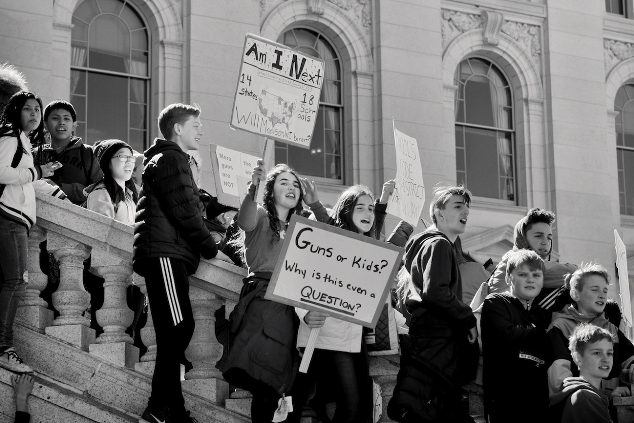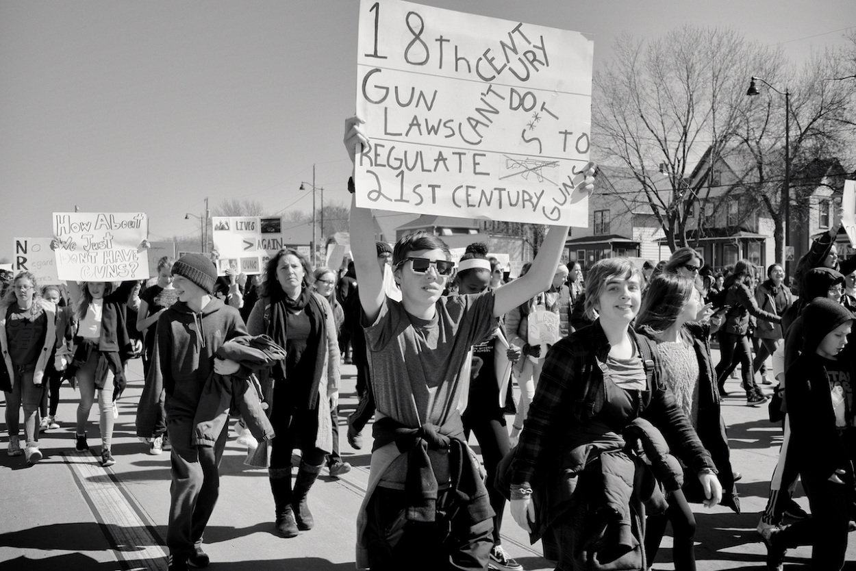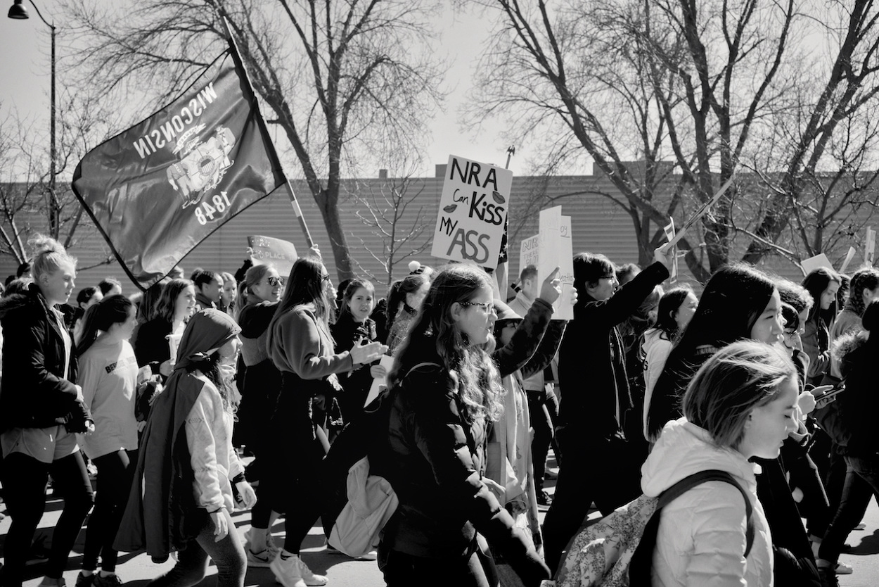 I stepped off the bus and saw the throng of students that had amassed at East High School. Police were directing traffic. Onlookers were cheering in support of the students. And everyone seemed to have a cell phone recording the event. I wandered around snapping pictures and taking in the scene. The crowd continued to swell and soon it was time to go. At once they formed a front line and moved forward down East Washington street towards the Capital. An estimated 3000 students marched from East High School to the Wisconsin State Capital building to meet up with students from the University of Wisconsin Madison and others. Along the way they chanted, “HEY, HEY, HO, HO, THE NRA HAVE GOT TO GO!”and “THIS IS WHAT DEMOCRACY LOOKS LIKE!” and “ARE WE NEXT?” Their signs shown brightly in the midday sun, telling the world how they were feeling and that they would not be ignored and were not going away.