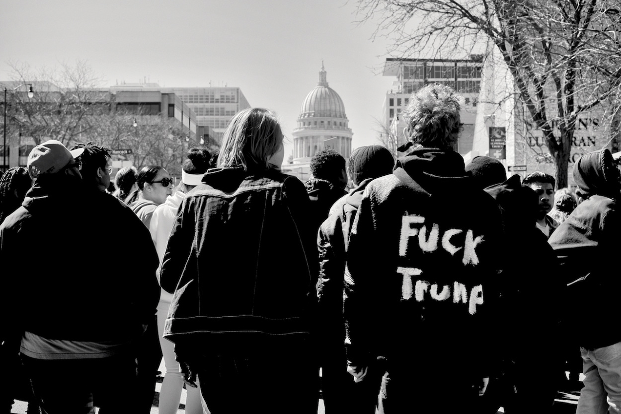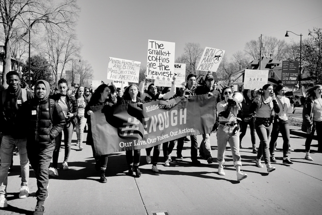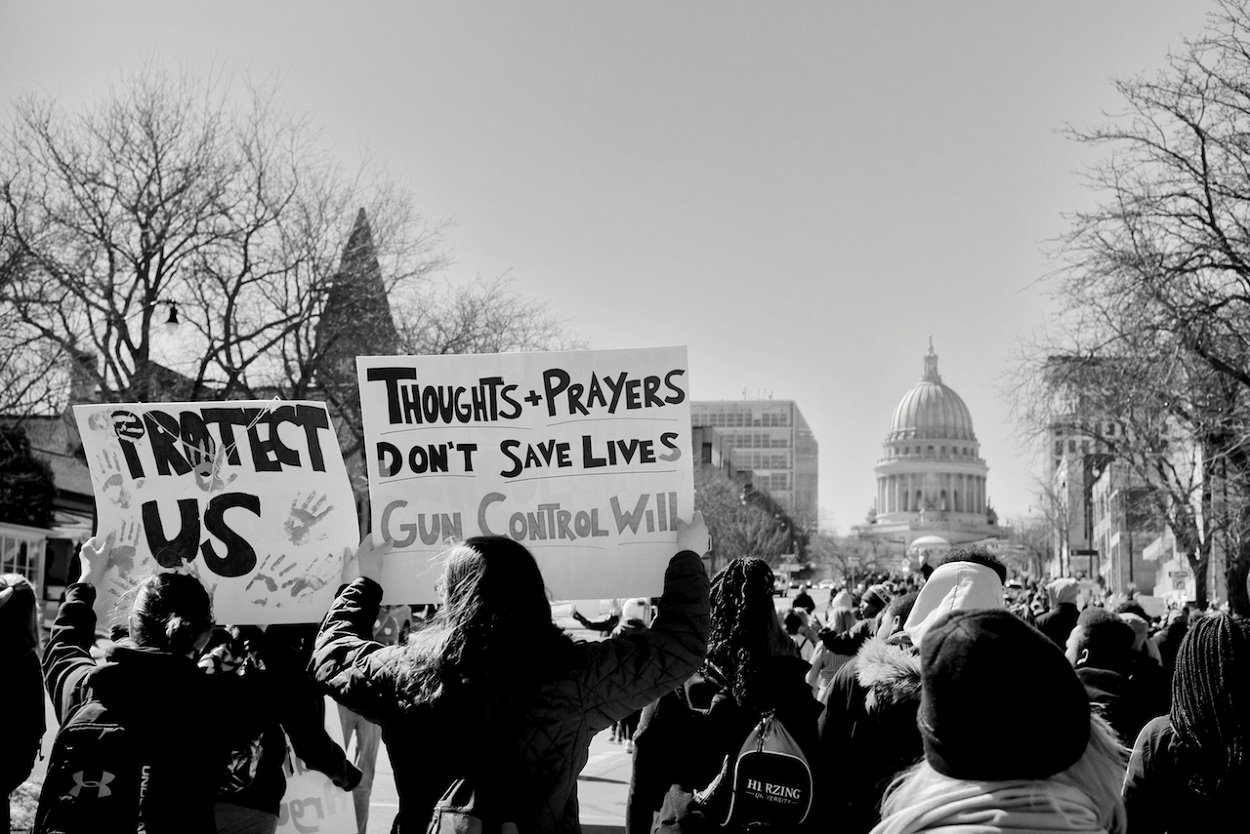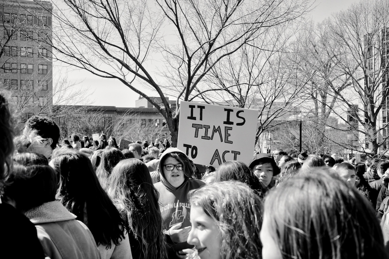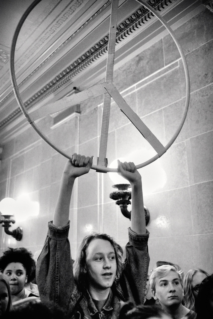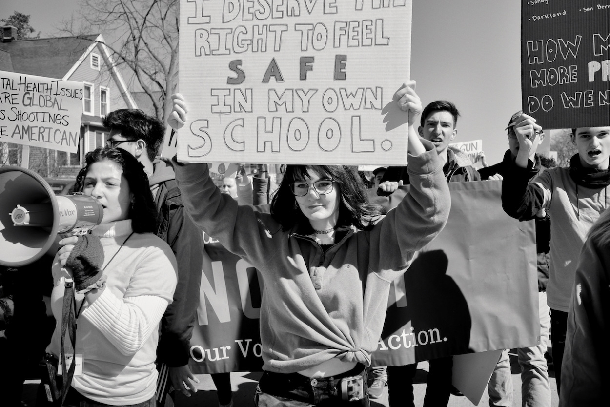 I stepped off the bus and saw the throng of students that had amassed at East High School. Police were directing traffic. Onlookers were cheering in support of the students. And everyone seemed to have a cell phone recording the event. I wandered around snapping pictures and taking in the scene. The crowd continued to swell and soon it was time to go. At once they formed a front line and moved forward down East Washington street towards the Capital. An estimated 3000 students marched from East High School to the Wisconsin State Capital building to meet up with students from the University of Wisconsin Madison and others. Along the way they chanted, “HEY, HEY, HO, HO, THE NRA HAVE GOT TO GO!”and “THIS IS WHAT DEMOCRACY LOOKS LIKE!” and “ARE WE NEXT?” Their signs shown brightly in the midday sun, telling the world how they were feeling and that they would not be ignored and were not going away.