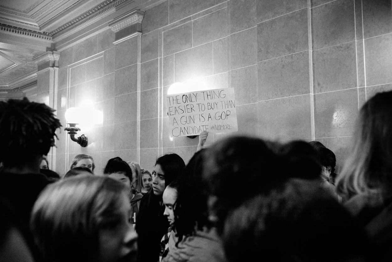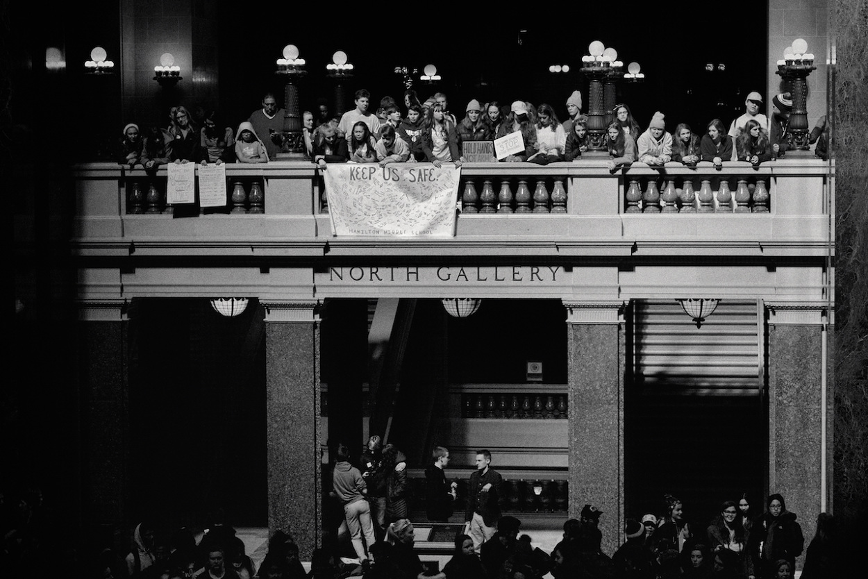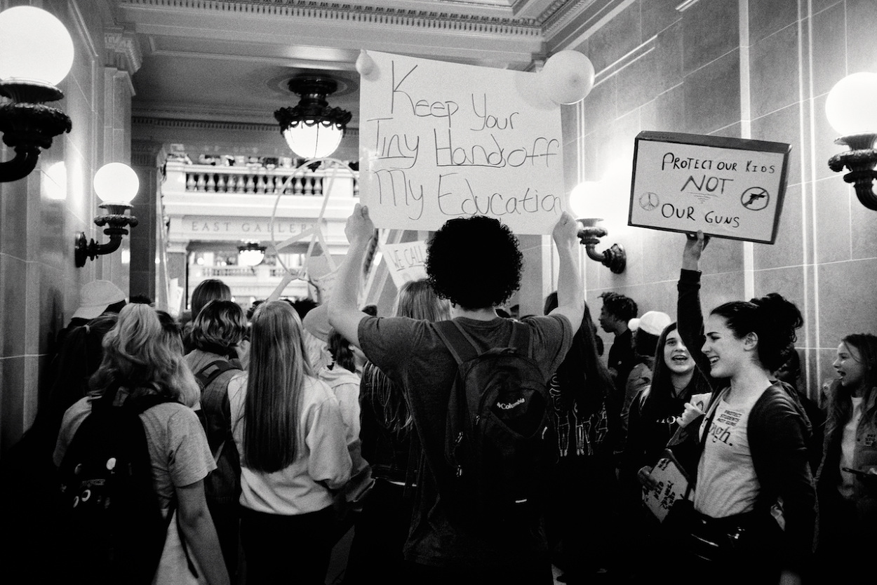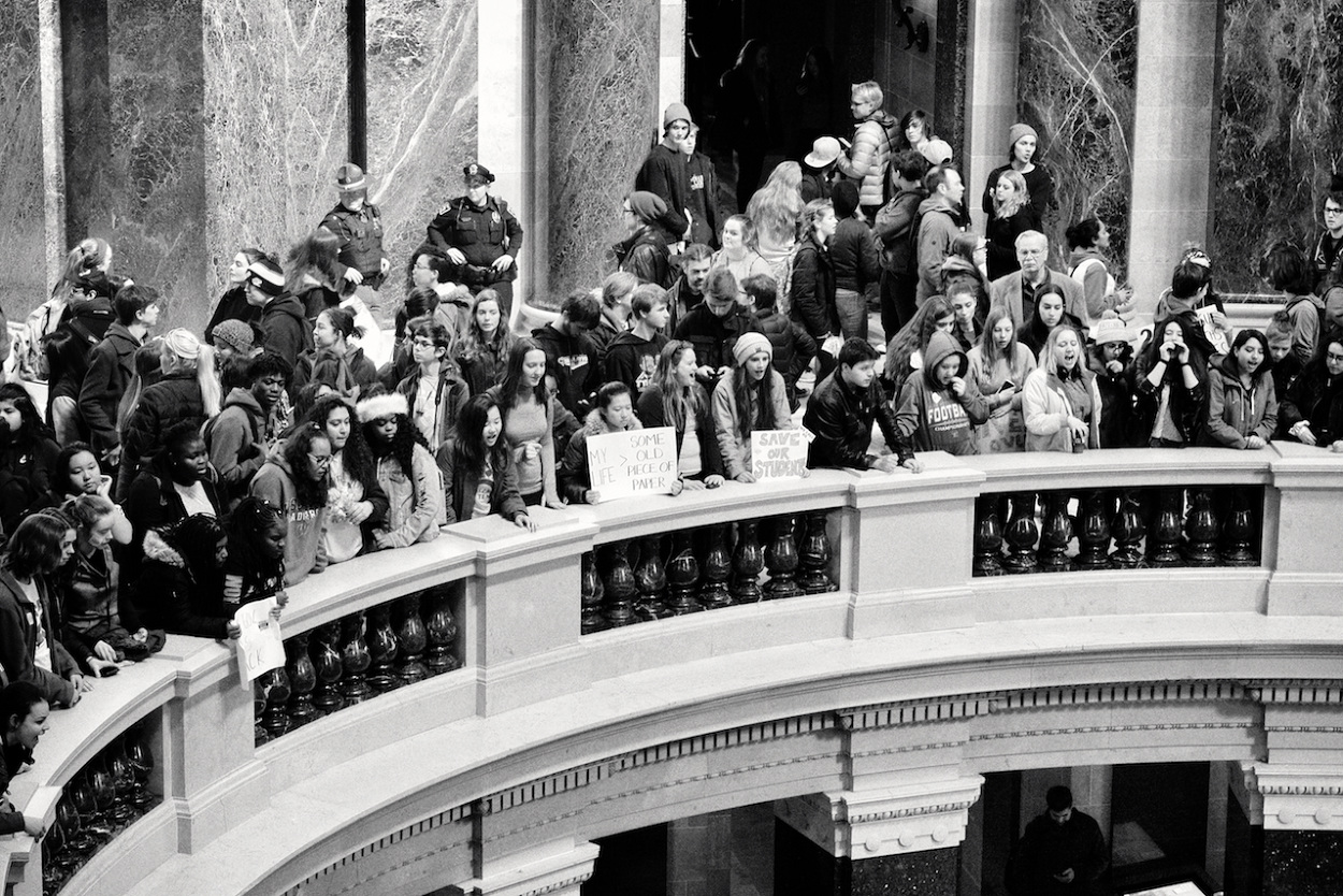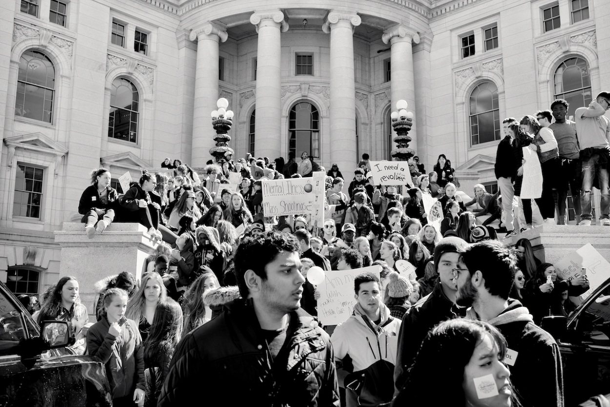 The street to the Capital was lined with onlookers and supporters, cheering the marchers on. Along the way people were handing out water as if the students were running a race; perhaps they were, a race for their lives. The marchers moved west as the eastbound traffic beeped their horns and pumped their fists in solidarity as they drove past. One car even slowed enough to high-five a student. The throng moved closer and closer to it’s destination, stopping only a few times to allow the back half of the procession to catch up. Arriving at the Capital they met with their fellow students and more supporters. Protestors blanketed the State Street side of the Capital; from the street, up the steps, right to the doors of the Capital building, spilling onto the lawn. It was a sight reminiscent of the 2011 protests.