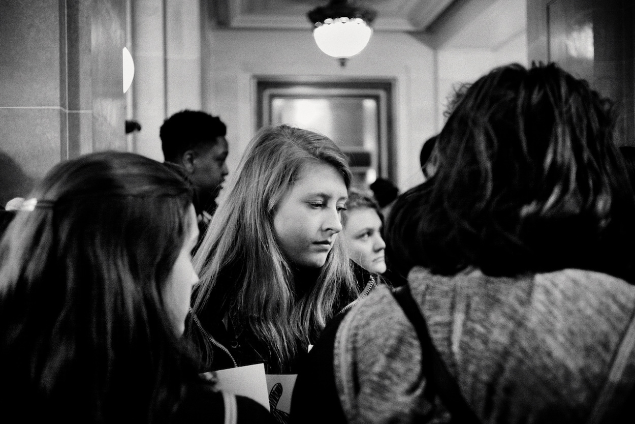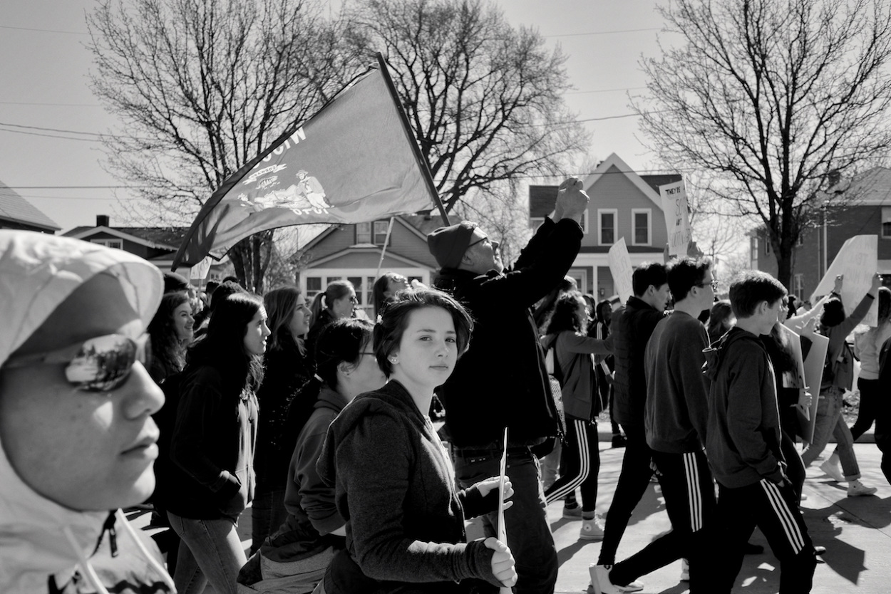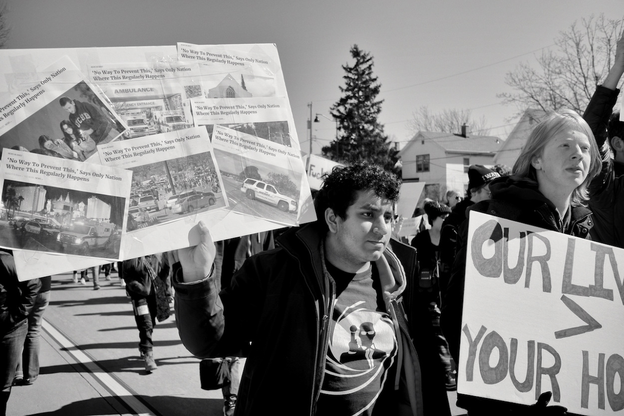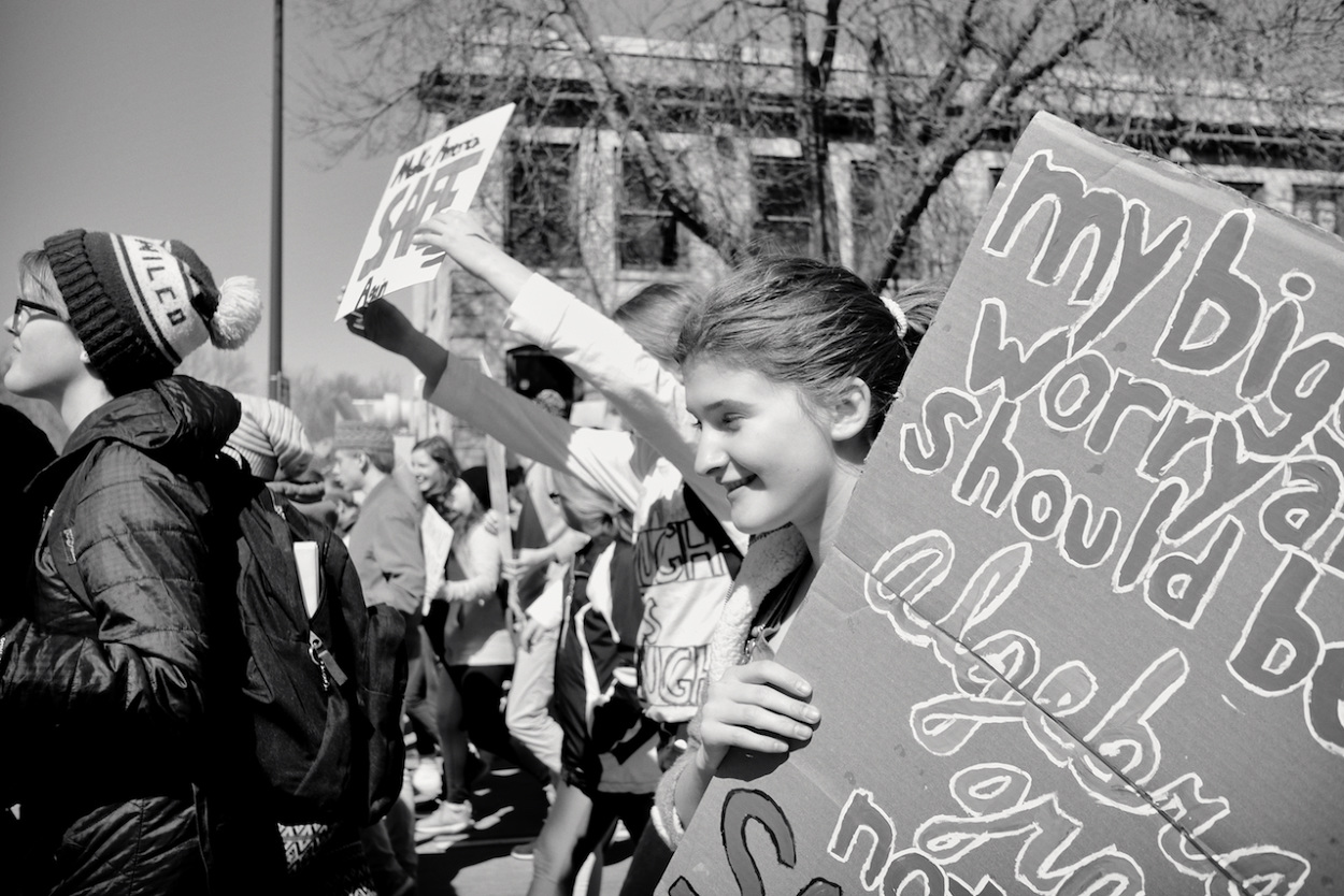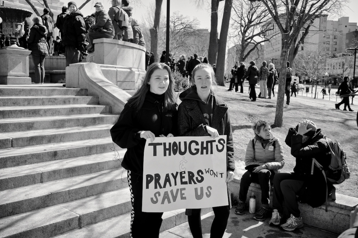 The street to the Capital was lined with onlookers and supporters, cheering the marchers on. Along the way people were handing out water as if the students were running a race; perhaps they were, a race for their lives. The marchers moved west as the eastbound traffic beeped their horns and pumped their fists in solidarity as they drove past. One car even slowed enough to high-five a student. The throng moved closer and closer to it’s destination, stopping only a few times to allow the back half of the procession to catch up. Arriving at the Capital they met with their fellow students and more supporters. Protestors blanketed the State Street side of the Capital; from the street, up the steps, right to the doors of the Capital building, spilling onto the lawn. It was a sight reminiscent of the 2011 protests.