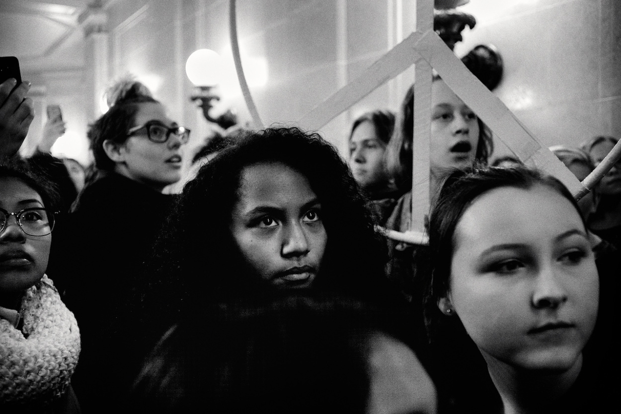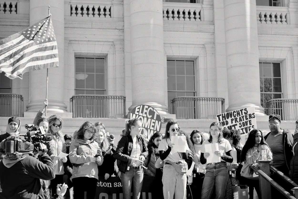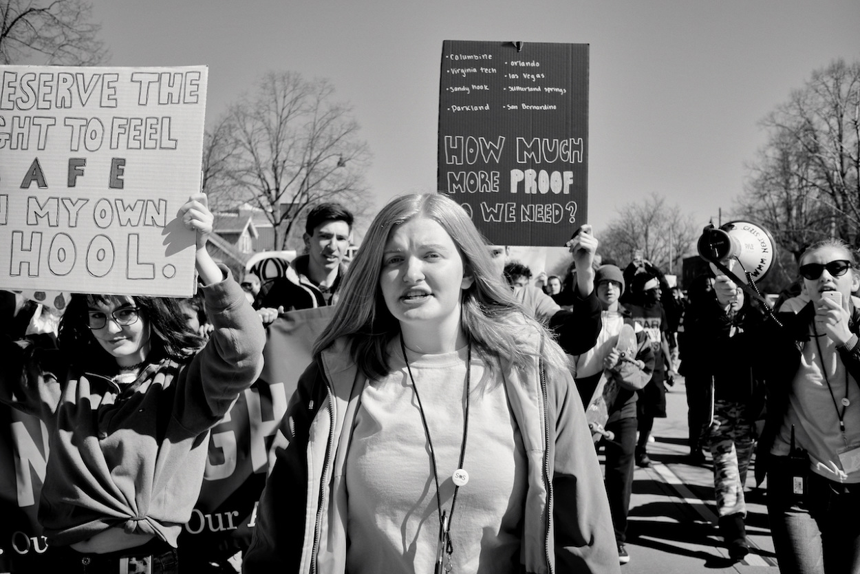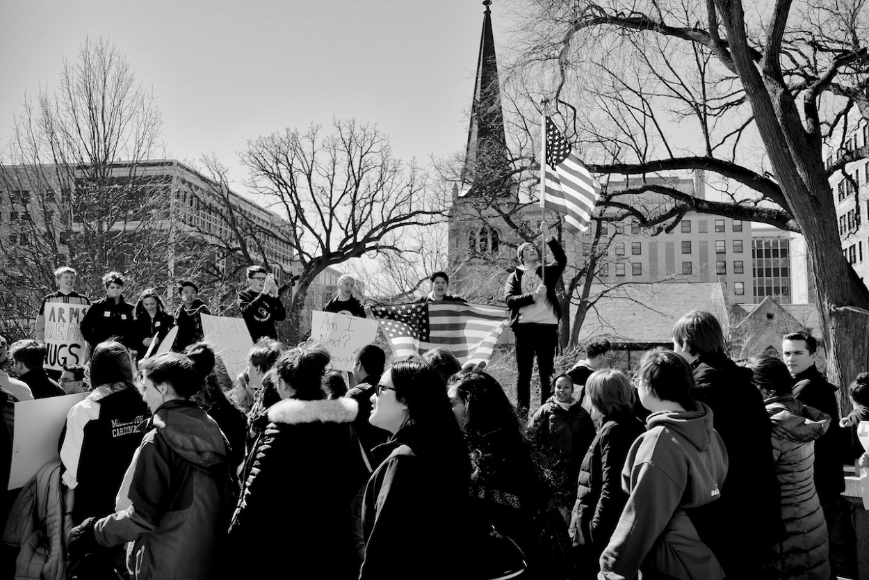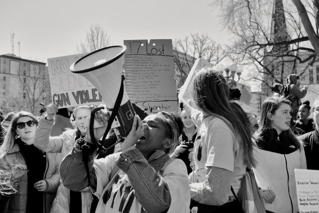 The street to the Capital was lined with onlookers and supporters, cheering the marchers on. Along the way people were handing out water as if the students were running a race; perhaps they were, a race for their lives. The marchers moved west as the eastbound traffic beeped their horns and pumped their fists in solidarity as they drove past. One car even slowed enough to high-five a student. The throng moved closer and closer to it’s destination, stopping only a few times to allow the back half of the procession to catch up. Arriving at the Capital they met with their fellow students and more supporters. Protestors blanketed the State Street side of the Capital; from the street, up the steps, right to the doors of the Capital building, spilling onto the lawn. It was a sight reminiscent of the 2011 protests.