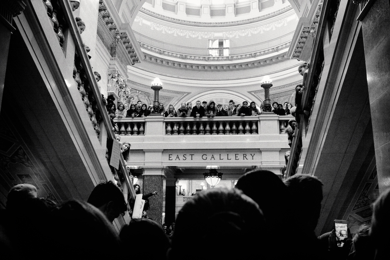 Outside there were speakers ranging from students to state representatives and senators. Inside protestors filled the rotunda from bottom to top. They crowded in the small hallway leading to the Office of the Governor. They chanted loudly and proudly, hoping that he would be listening. Two students approached the police officers guarding the Office of the Governor. One asked, “What do you think of this?” He replied politely, “When I put this uniform on I no longer have an opinion on such matters.” The student wasn’t quite sure what to say. I believe she thought he would say he supported them and keep up the fight. Another asked if the Governor was coming out. The look the officer gave the student said it all. Governor Scott Walker was not in. He was conveniently in another city today.