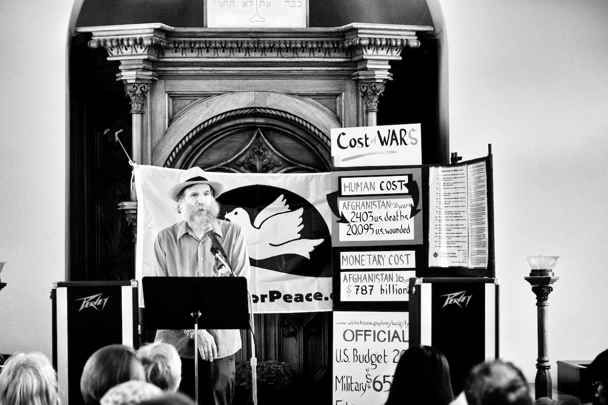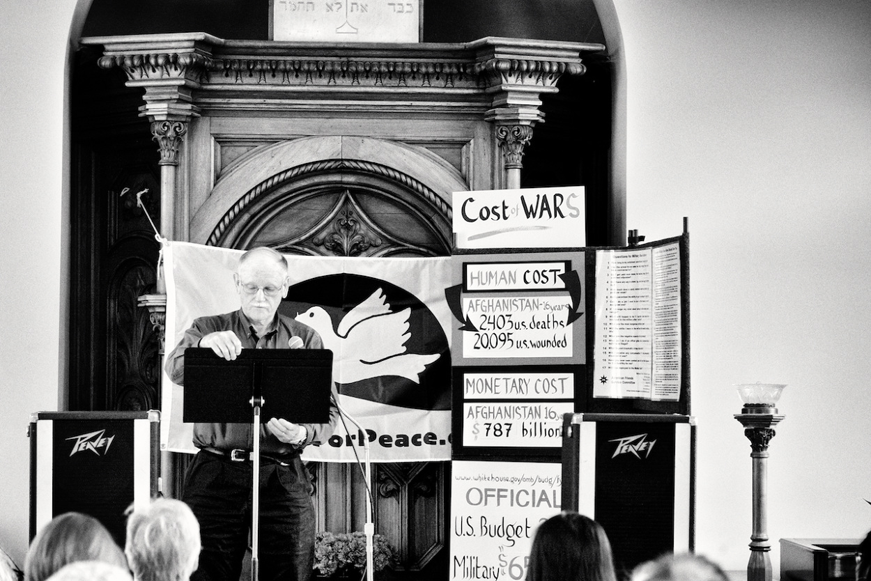 The last stop was a peace rally at the Gates of Heaven Synagogue. It was organized by Veterans for Peace, a group made up of veterans and non-veterans who oppose war. This event focused on the human and monetary costs of war. They talked about the innocent lives lost and about the insane amount of money spent on war and how it could have been used to provide help and support to those in need, to improve education, and repair our collapsing infrastructure, instead of serving the masters of war.