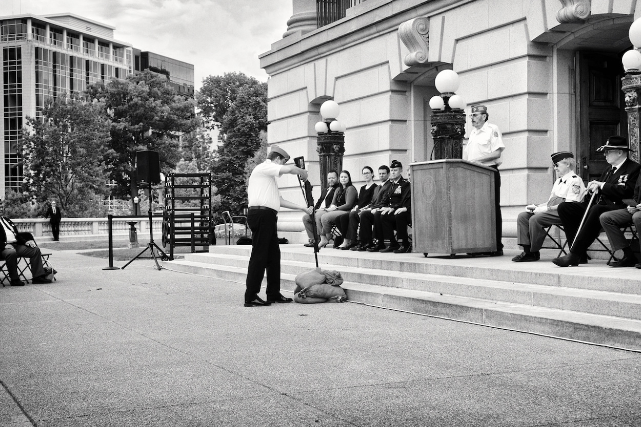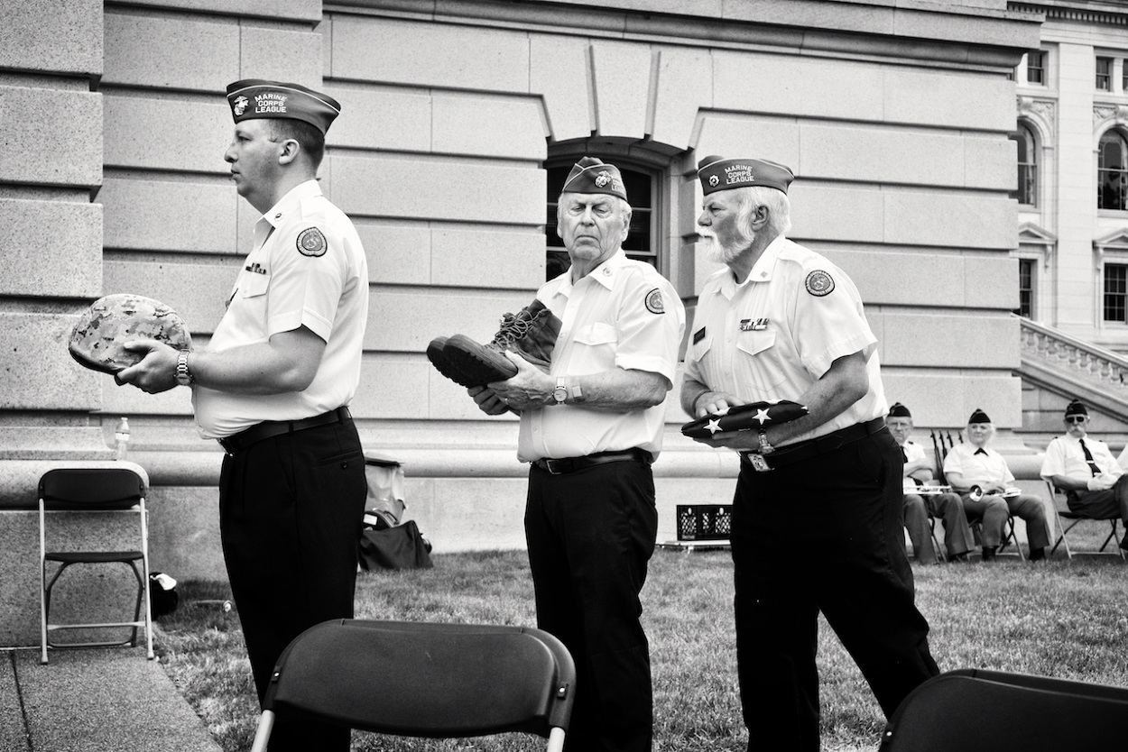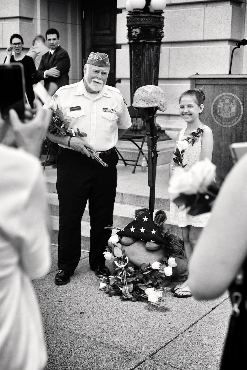Next stop, the Wisconsin State Capital. This event was a broad, all encompassing event, focusing on all wars and conflicts, and men and women from all branches of the armed services. Here was a more diverse group of veterans and attendees. A band played. A soldiers cross was constructed. And the names of the numerous wars and conflicts were called out, prompting a representative to come forward and place a flower at the base of the soldiers cross.