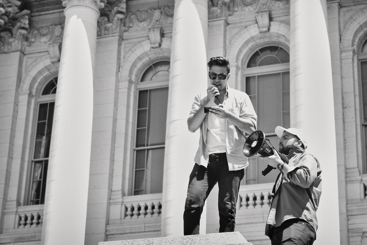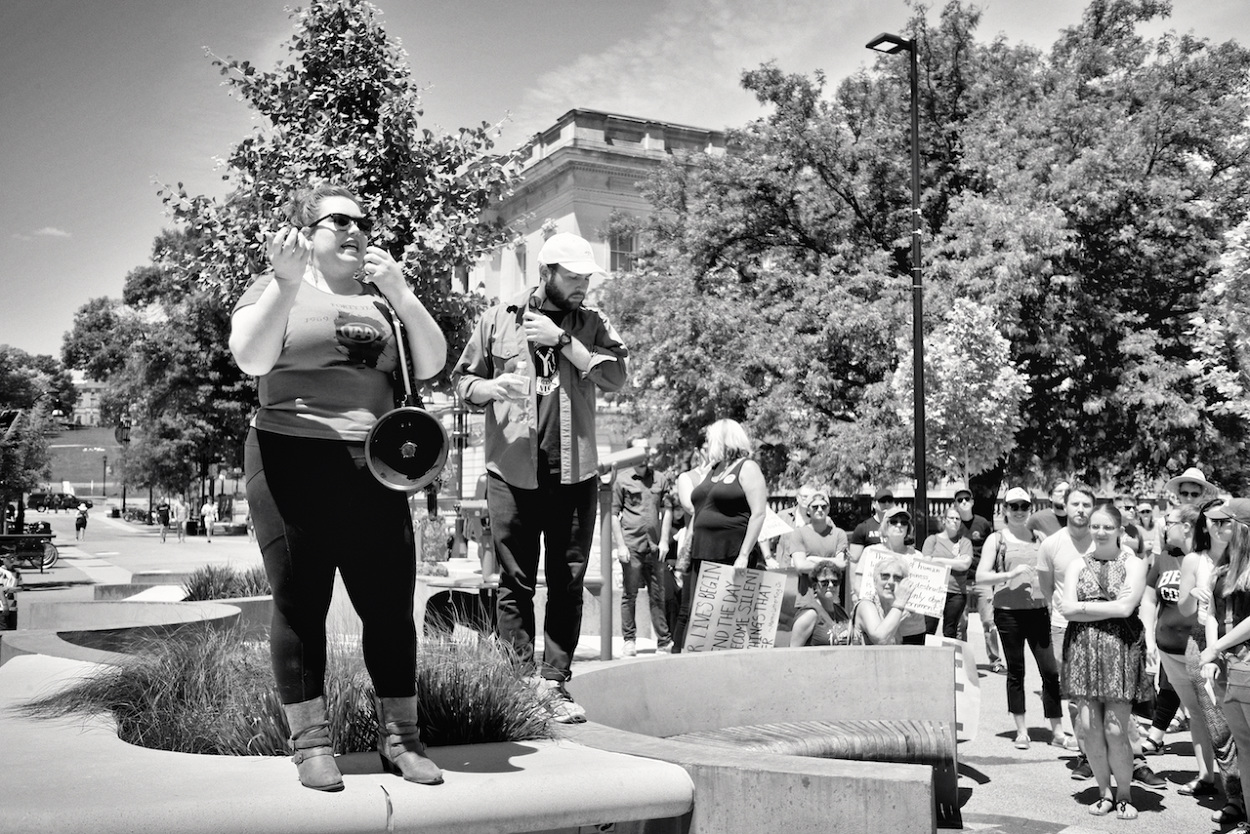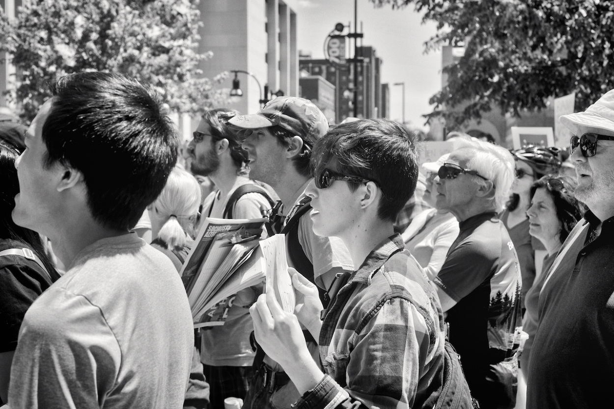 A crowd of 300 – 400 people marched from Library Mall down State Street to the capital building. Stopping along the way to chant or listen to speakers, the marchers did one of the things a peaceful protest should: disrupted the normal flow of daily life, making those walking down the street to pause and look up, at intersections providing a delay in traffic, and chanting and speaking clearly and loudly their message.