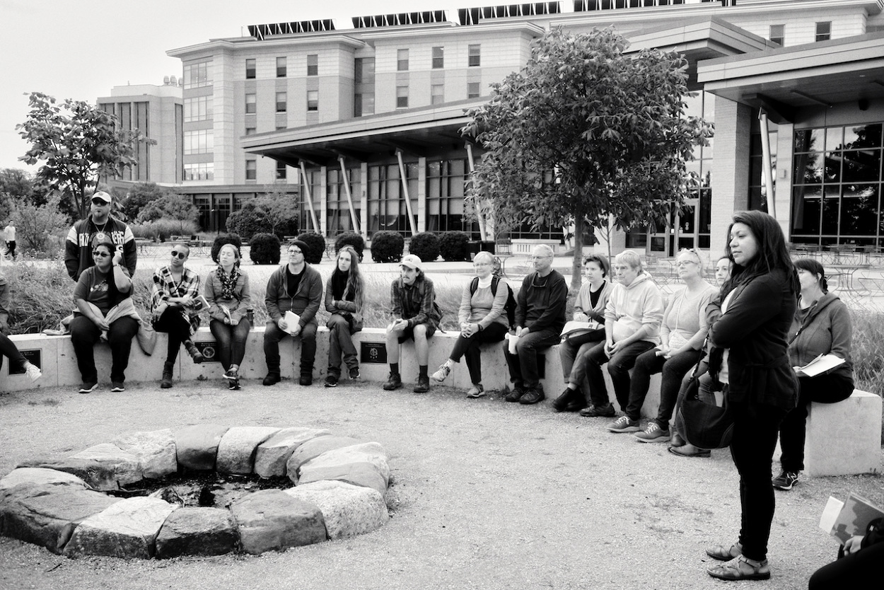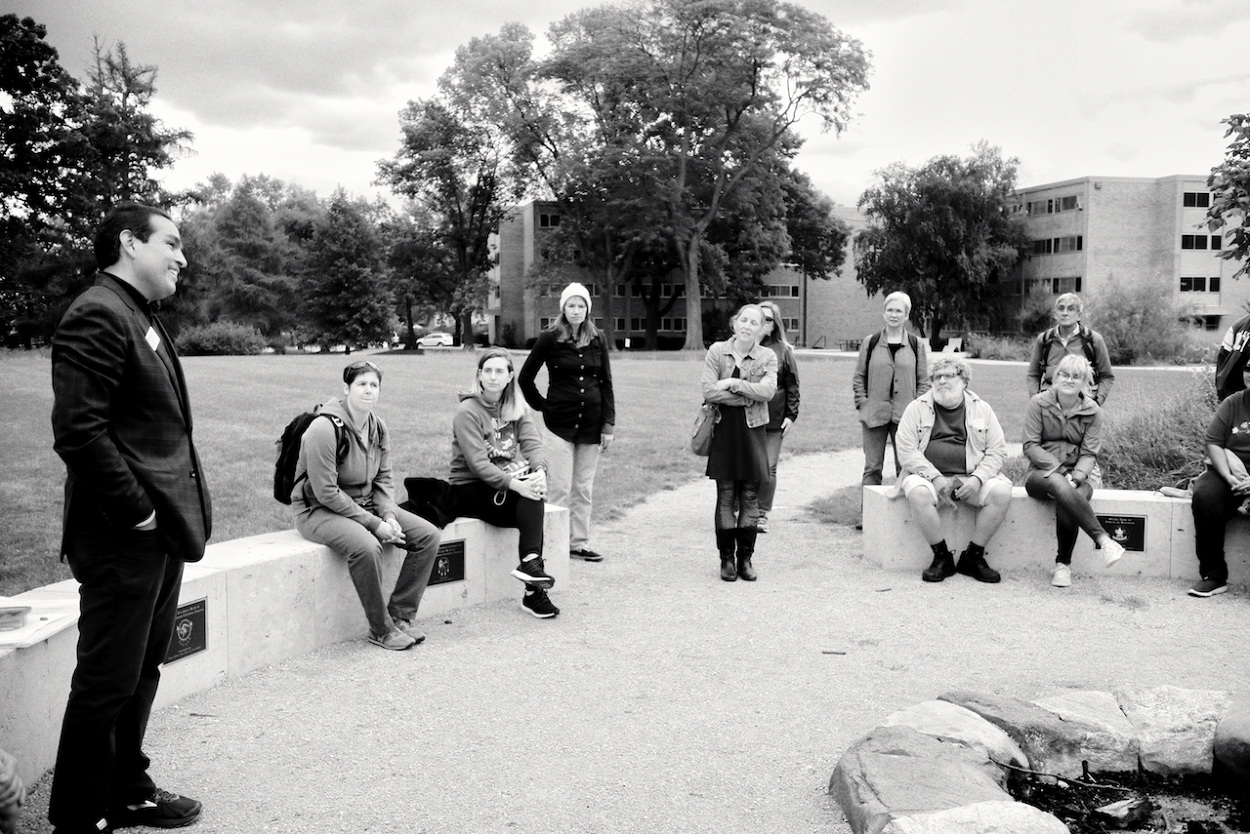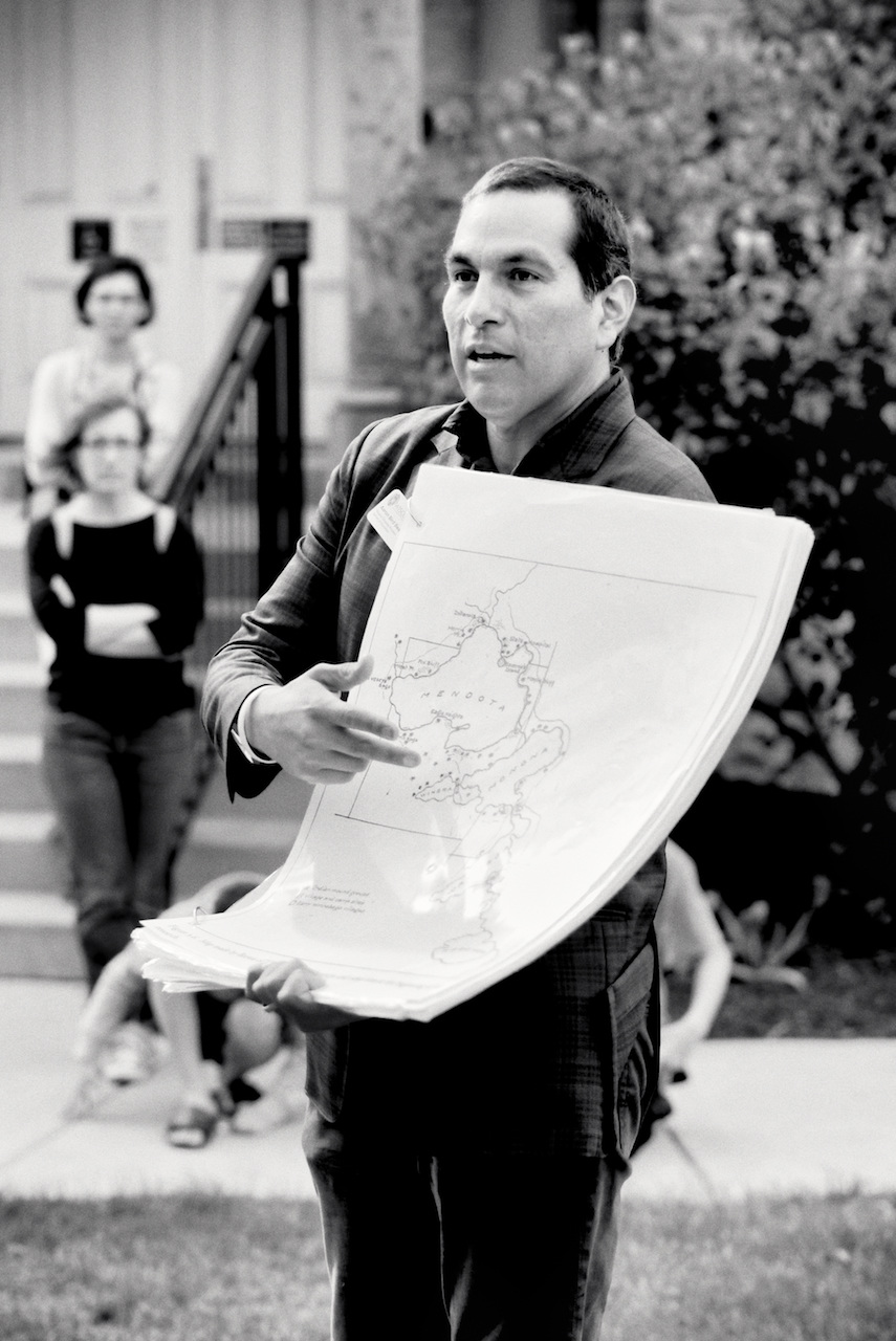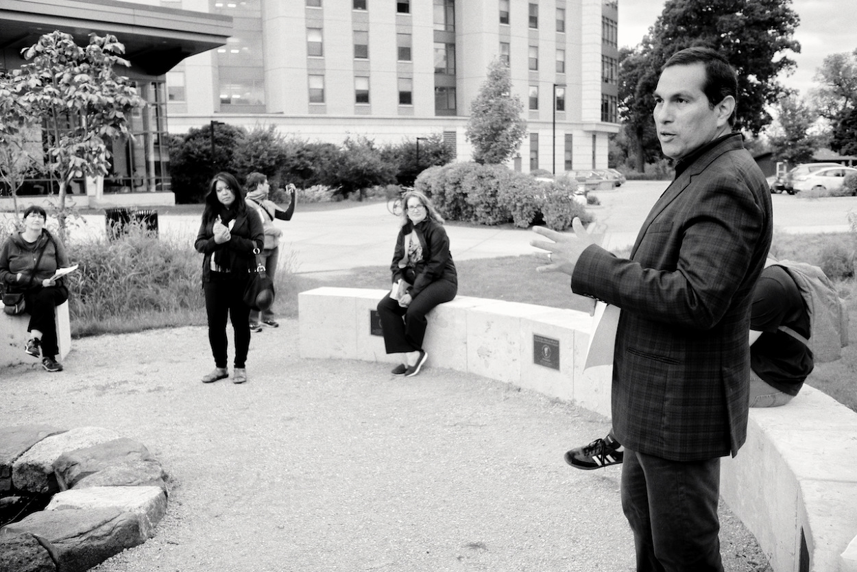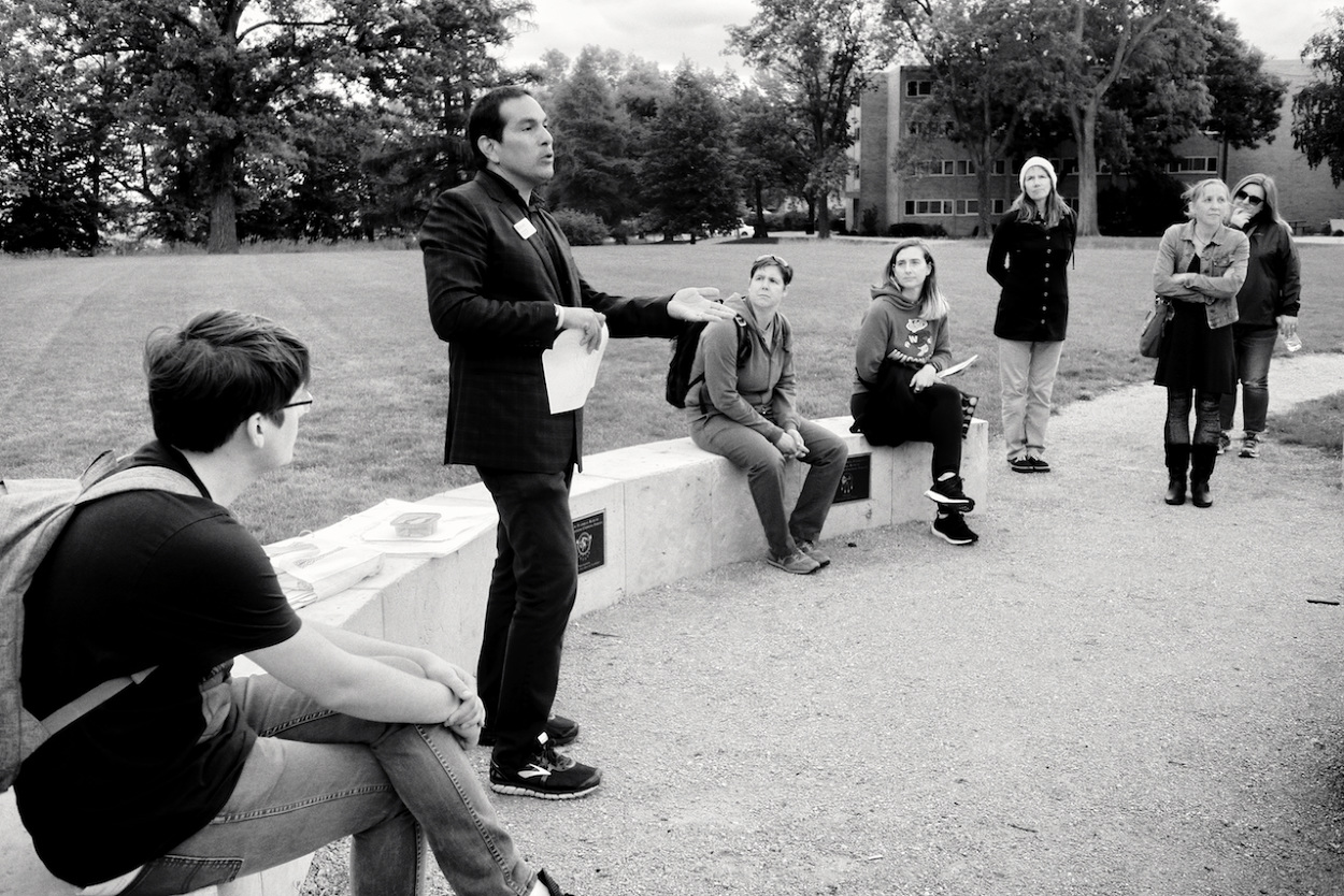 Photos of Aaron Bird Bear and Omar Poler as they lead a UW-Madison First Nations Cultural Landscape Tour.