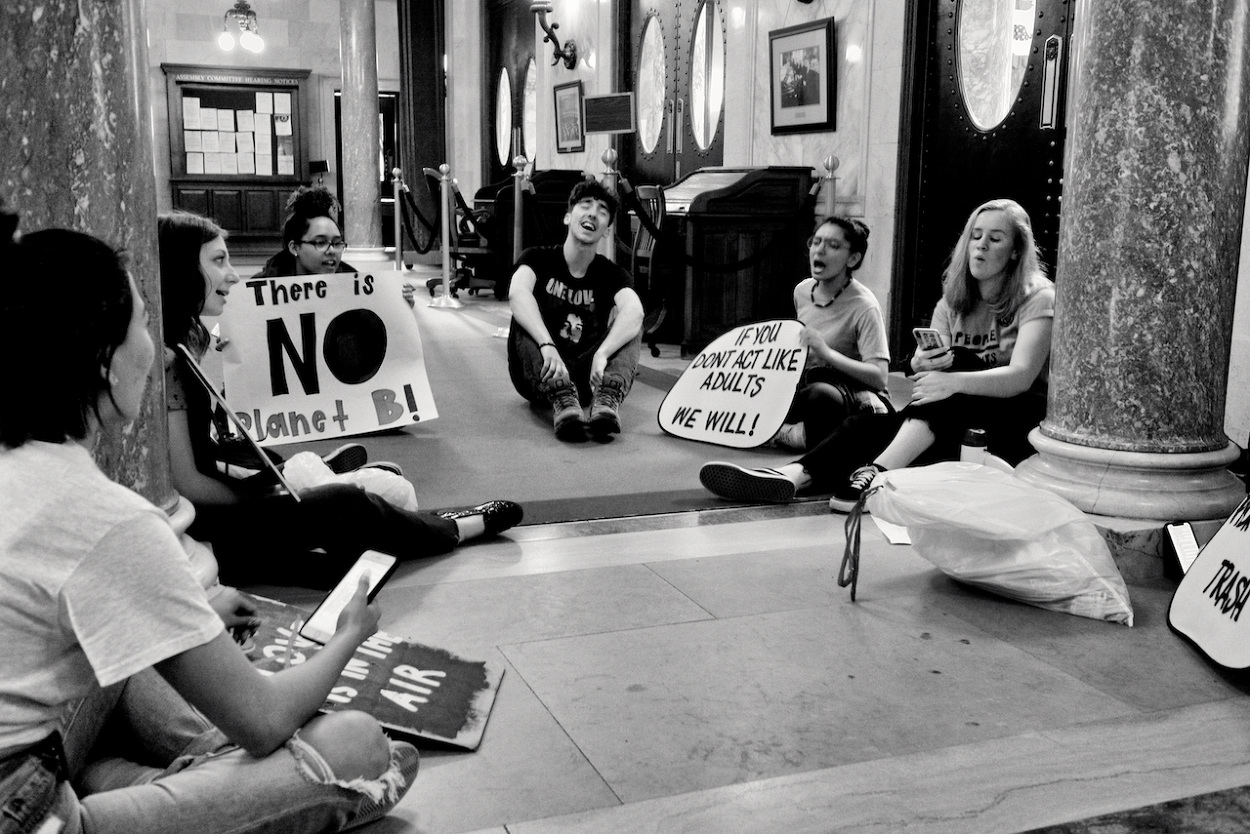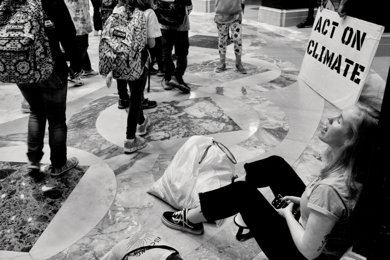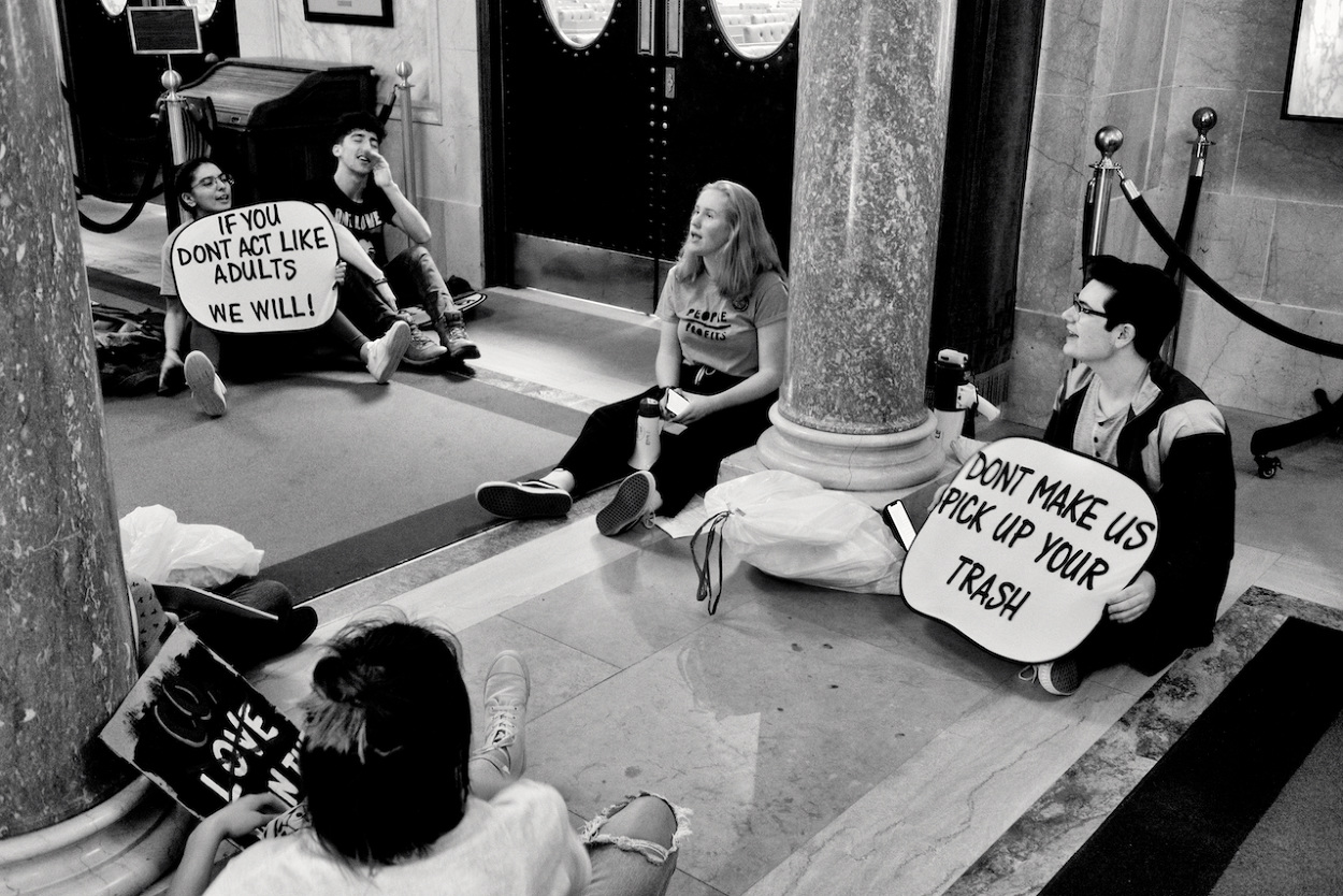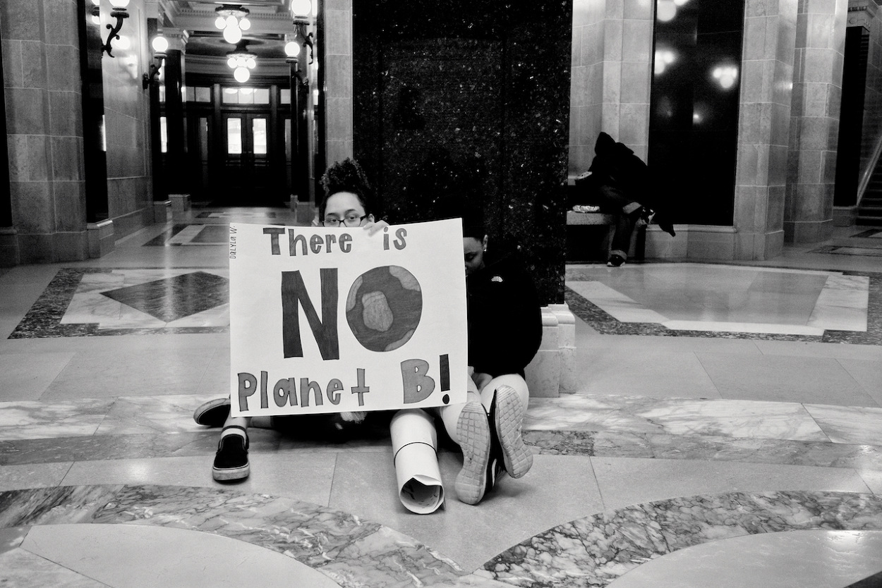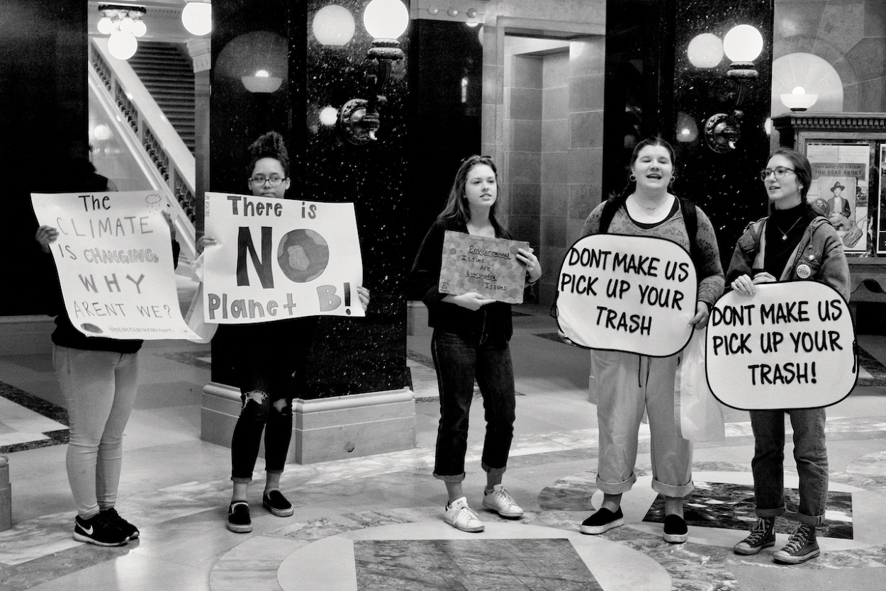 In a follow up to the WI Youth Strike for Climate Justice on March 15th 2019, the Youth Action Climate Team held a solidarity strike in the Wisconsin State Capitol’s rotunda. A dozen youth and community activists collected garbage from around the capitol grounds. In addition, activists occupied the rotunda floor for 11 minutes, representing the number of years the environment has until we reach a point of no return. With chants that echoed throughout the capitol building, the group marched through the corridors and hallways before conducting a sit-in outside the assembly, where they were monitored by capitol police, once receiving a stern warning against using a megaphone inside the room.