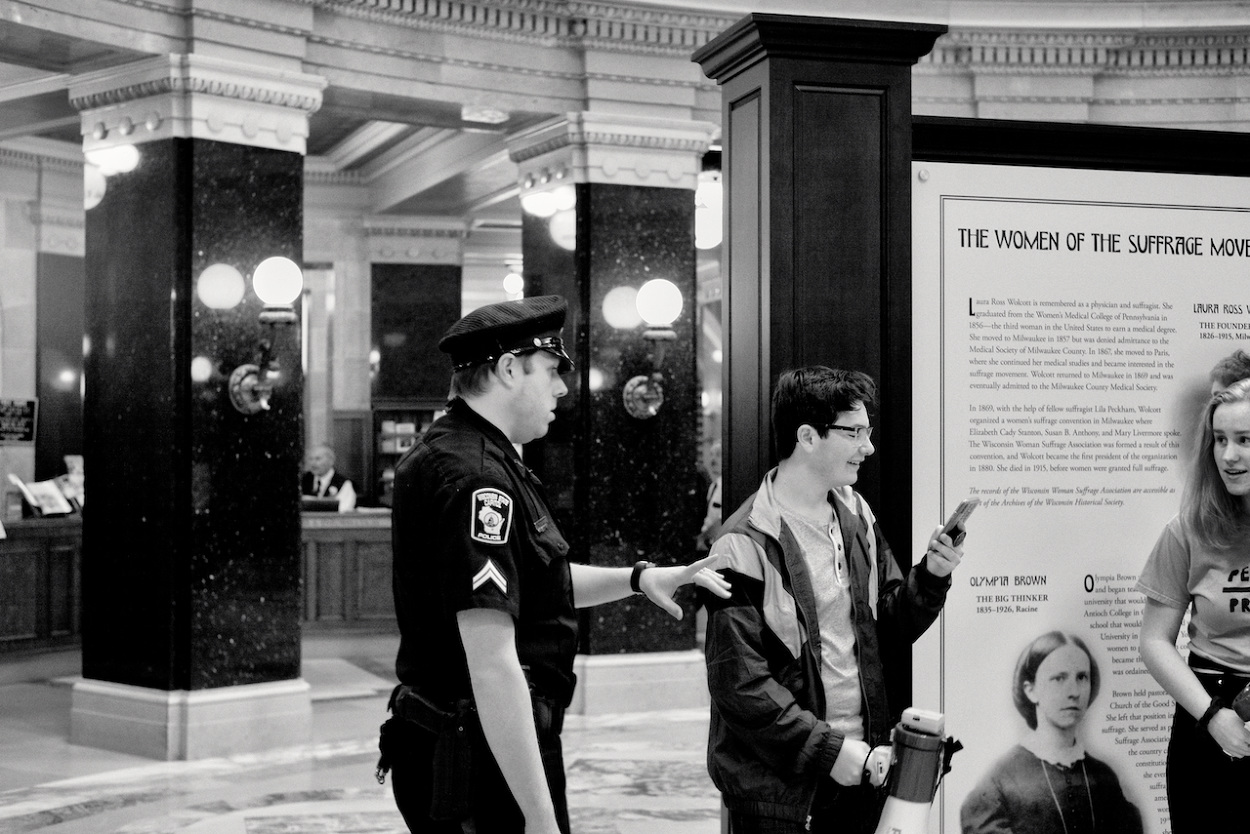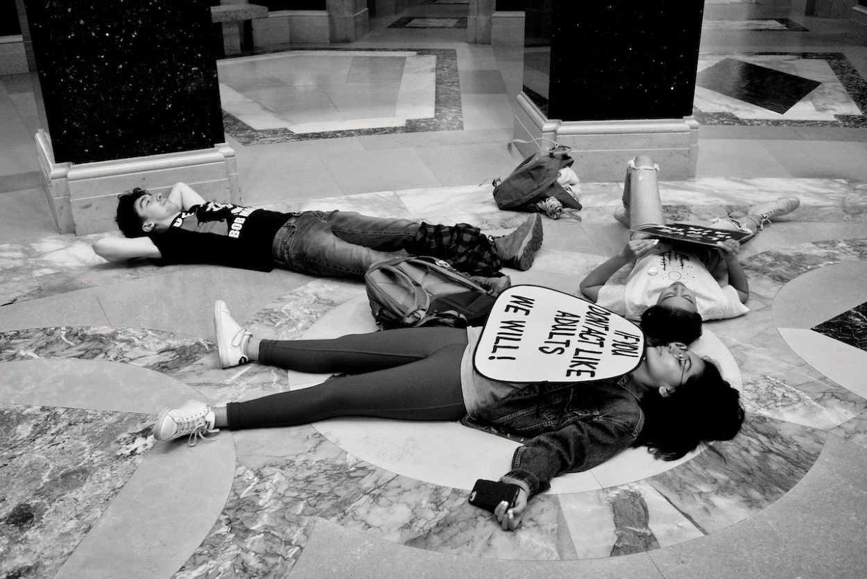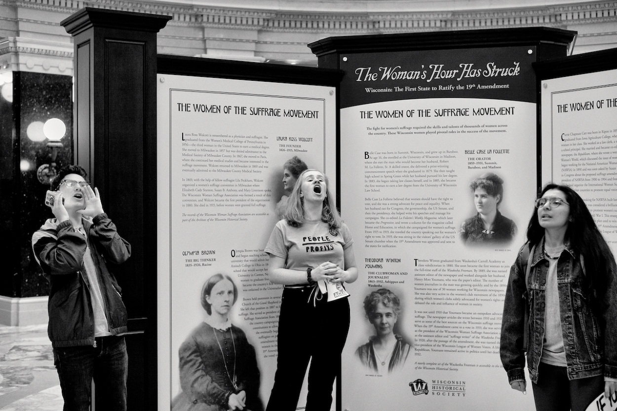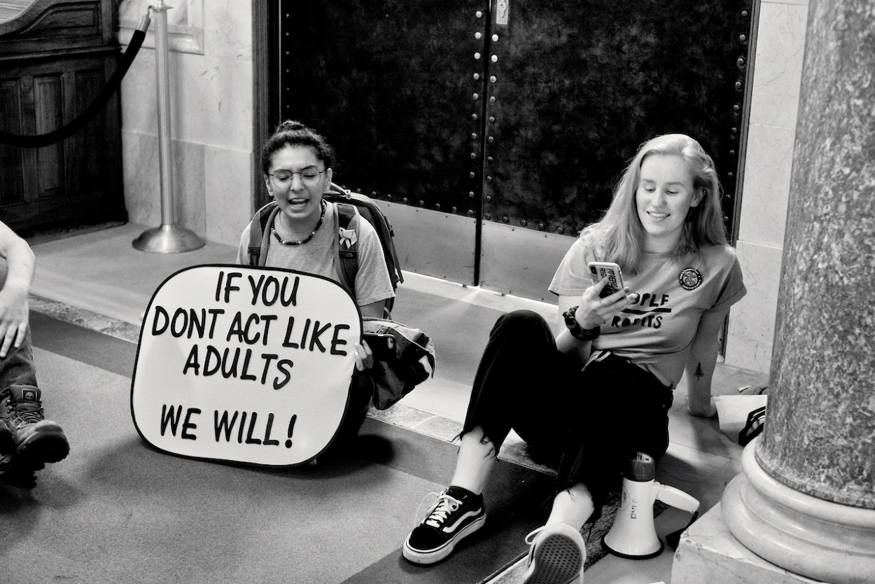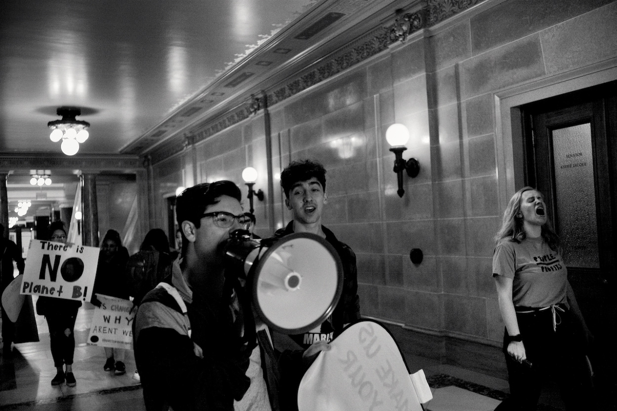 In a follow up to the WI Youth Strike for Climate Justice on March 15th 2019, the Youth Action Climate Team held a solidarity strike in the Wisconsin State Capitol’s rotunda. A dozen youth and community activists collected garbage from around the capitol grounds. In addition, activists occupied the rotunda floor for 11 minutes, representing the number of years the environment has until we reach a point of no return. With chants that echoed throughout the capitol building, the group marched through the corridors and hallways before conducting a sit-in outside the assembly, where they were monitored by capitol police, once receiving a stern warning against using a megaphone inside the room.