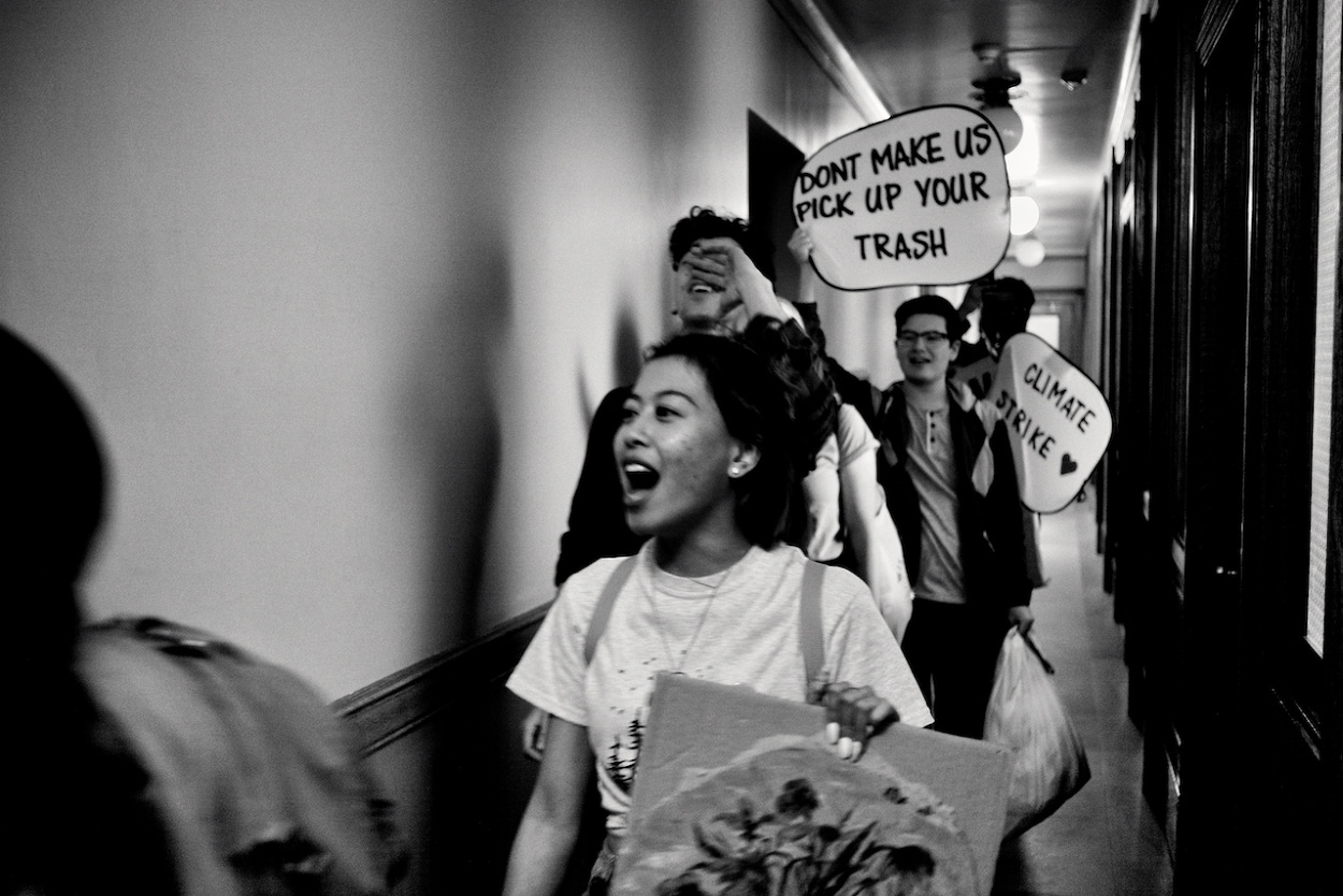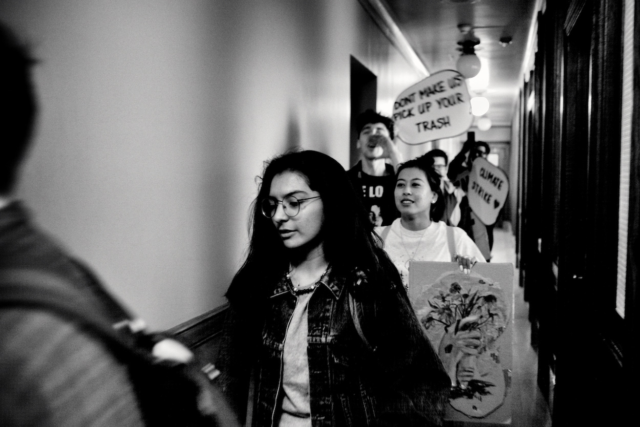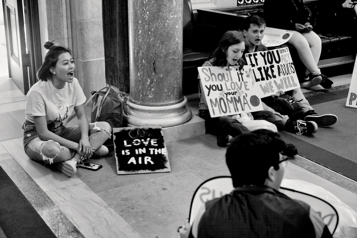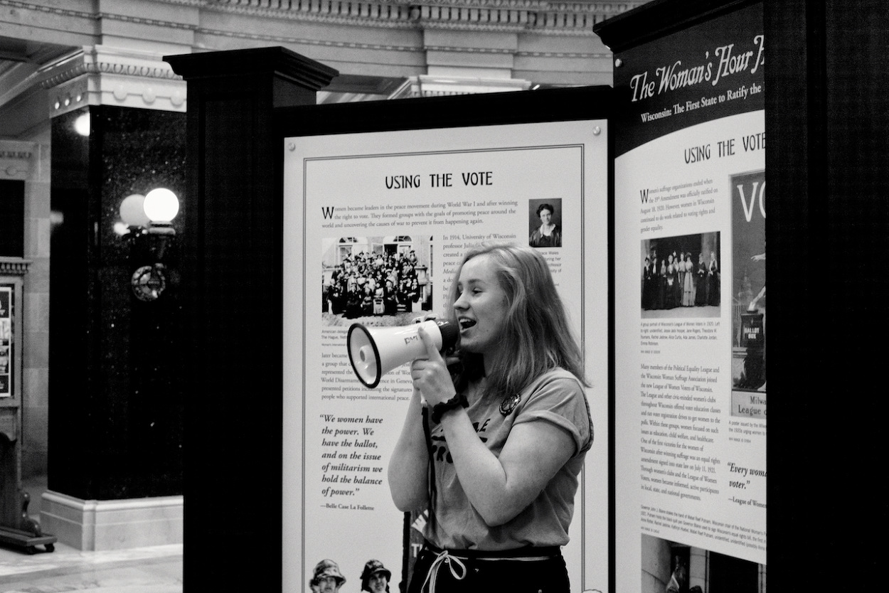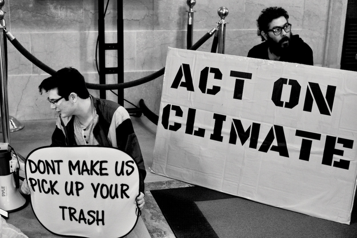 In a follow up to the WI Youth Strike for Climate Justice on March 15th 2019, the Youth Action Climate Team held a solidarity strike in the Wisconsin State Capitol’s rotunda. A dozen youth and community activists collected garbage from around the capitol grounds. In addition, activists occupied the rotunda floor for 11 minutes, representing the number of years the environment has until we reach a point of no return. With chants that echoed throughout the capitol building, the group marched through the corridors and hallways before conducting a sit-in outside the assembly, where they were monitored by capitol police, once receiving a stern warning against using a megaphone inside the room.