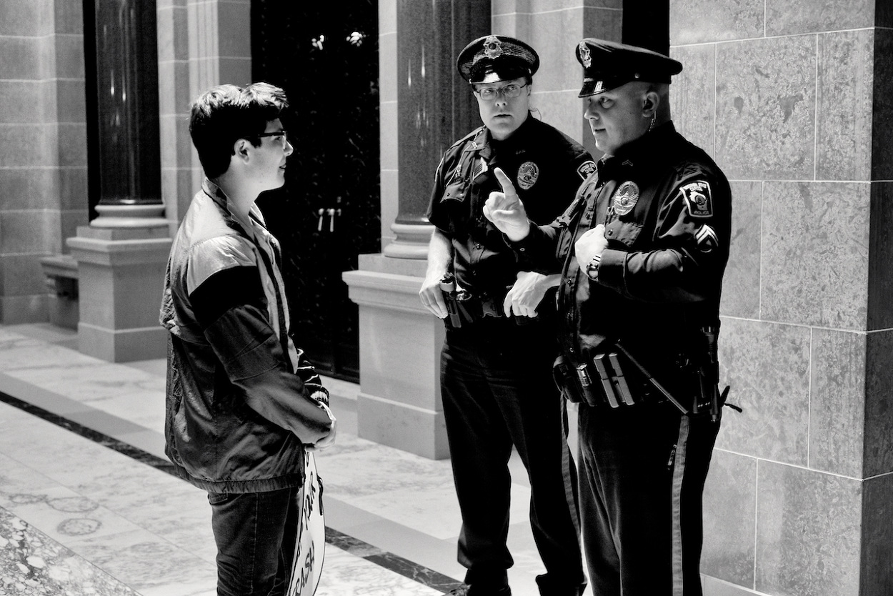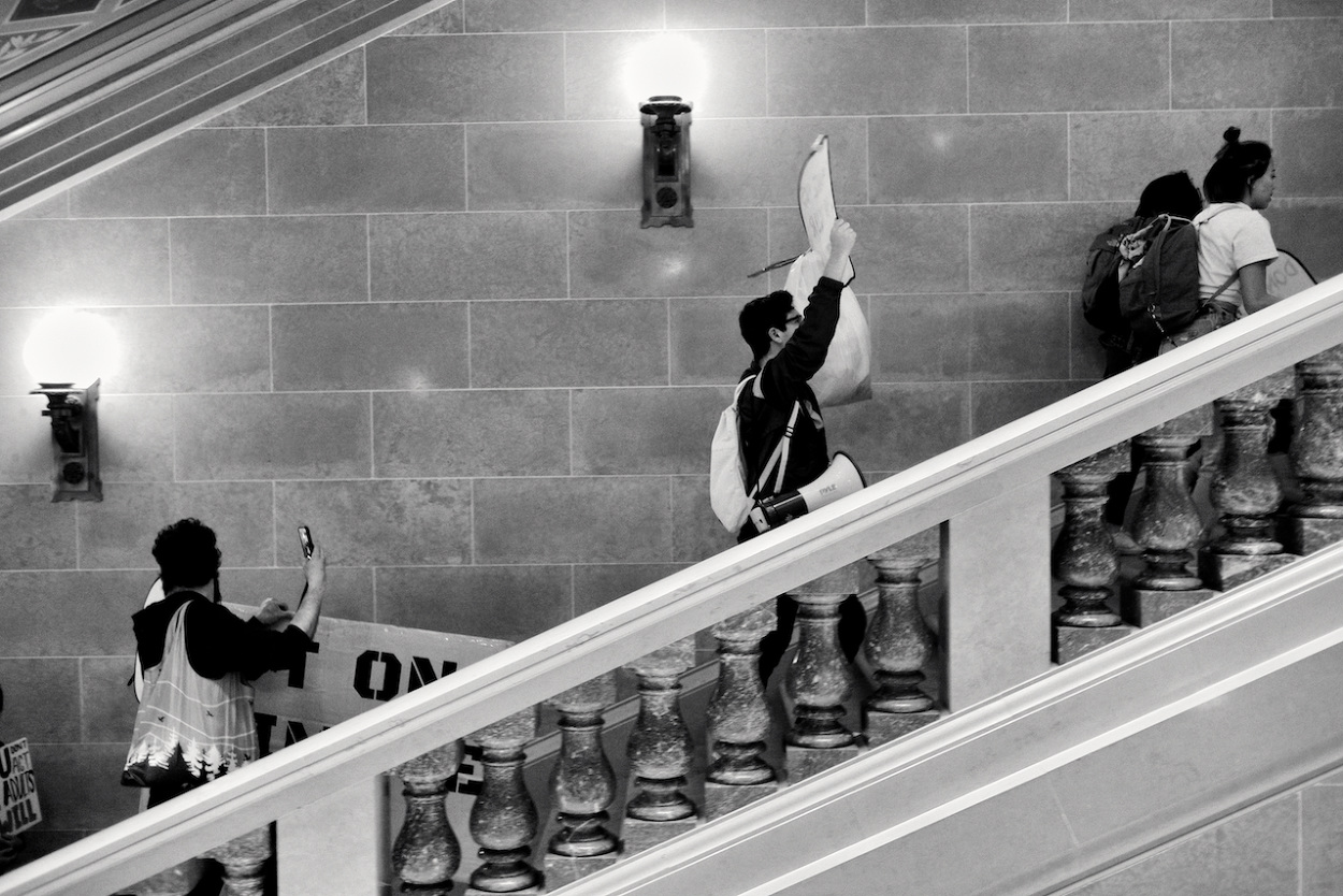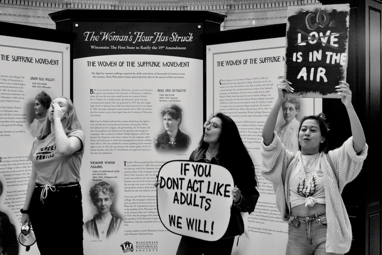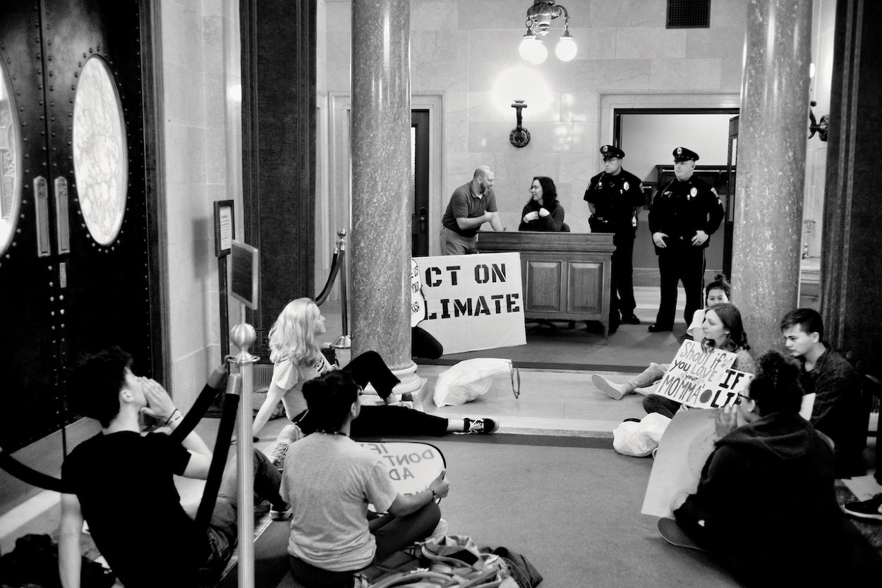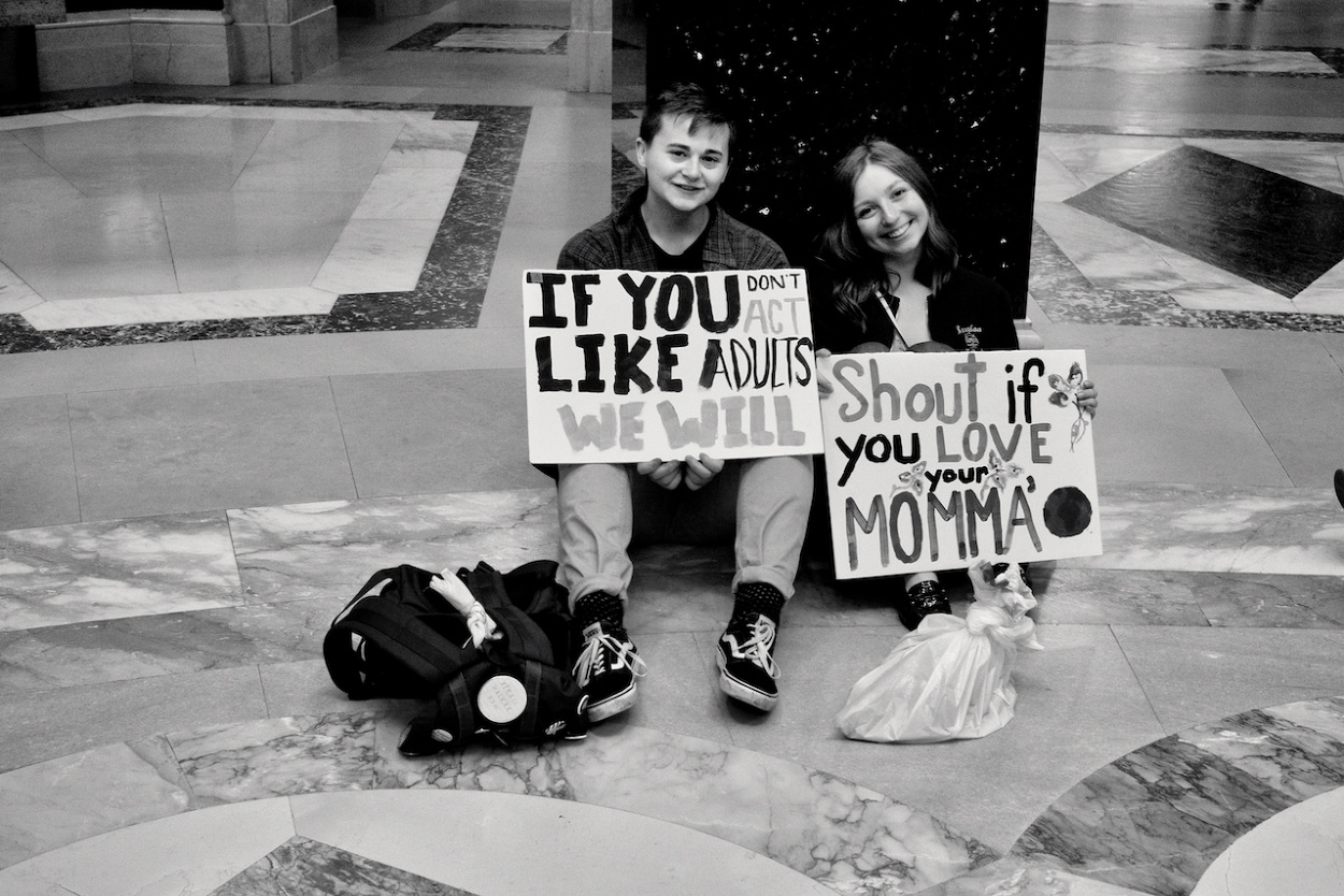 In a follow up to the WI Youth Strike for Climate Justice on March 15th 2019, the Youth Action Climate Team held a solidarity strike in the Wisconsin State Capitol’s rotunda. A dozen youth and community activists collected garbage from around the capitol grounds. In addition, activists occupied the rotunda floor for 11 minutes, representing the number of years the environment has until we reach a point of no return. With chants that echoed throughout the capitol building, the group marched through the corridors and hallways before conducting a sit-in outside the assembly, where they were monitored by capitol police, once receiving a stern warning against using a megaphone inside the room.