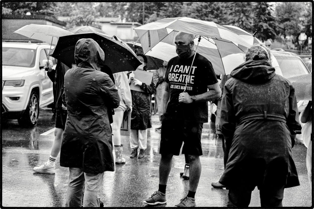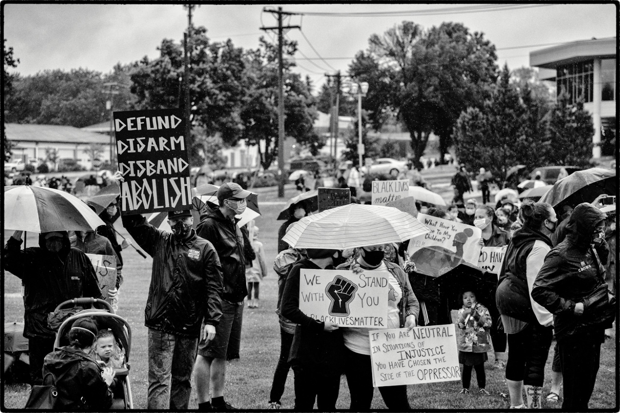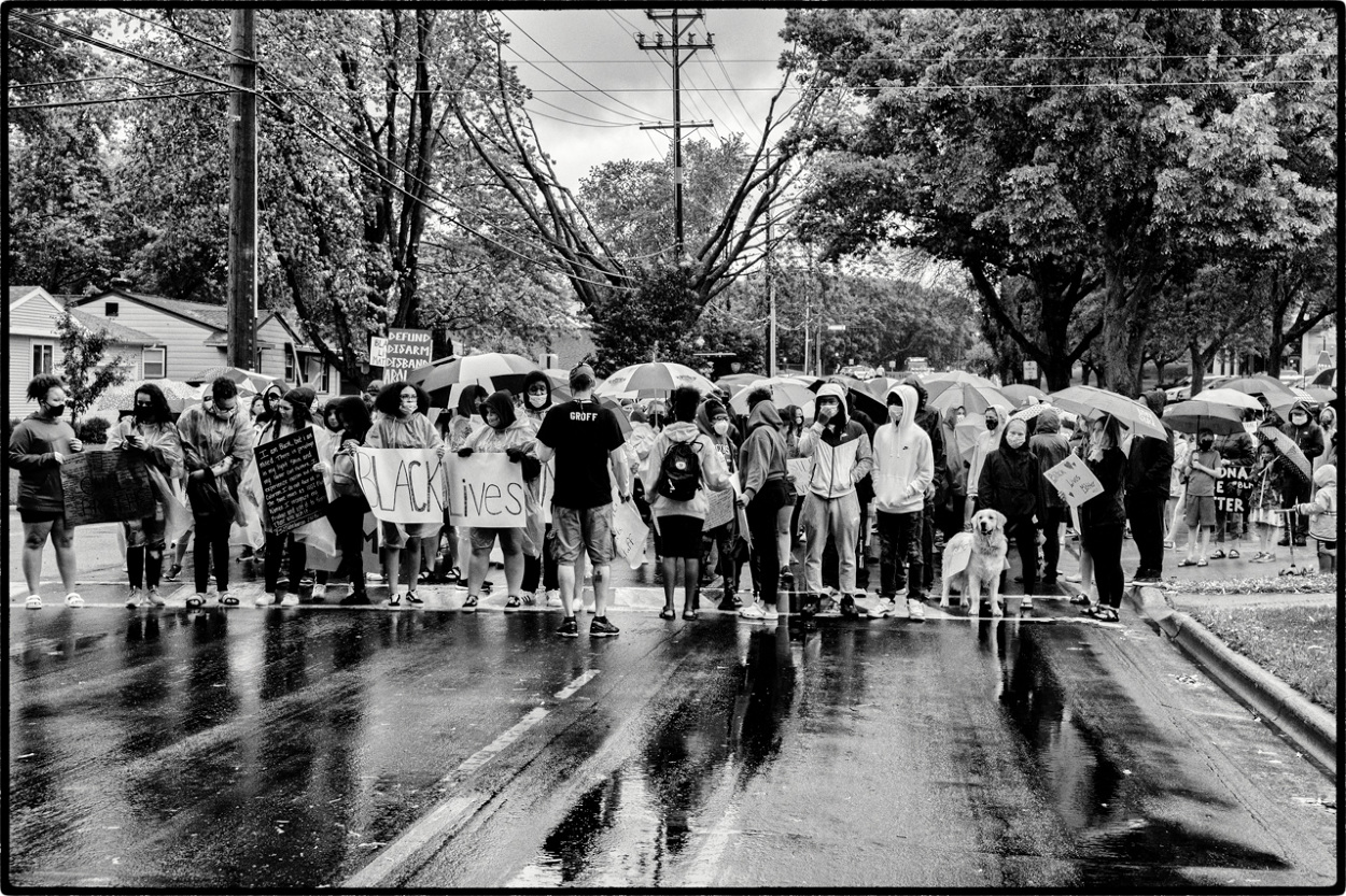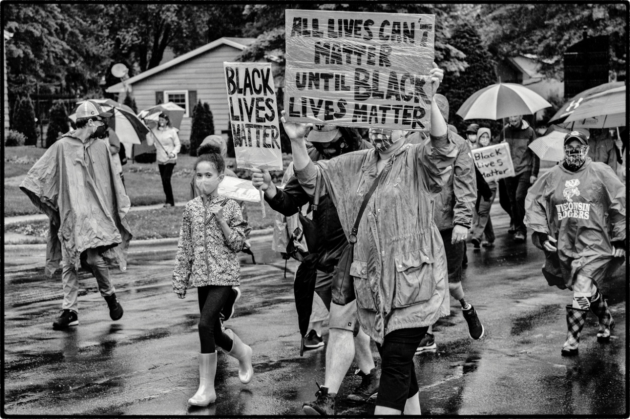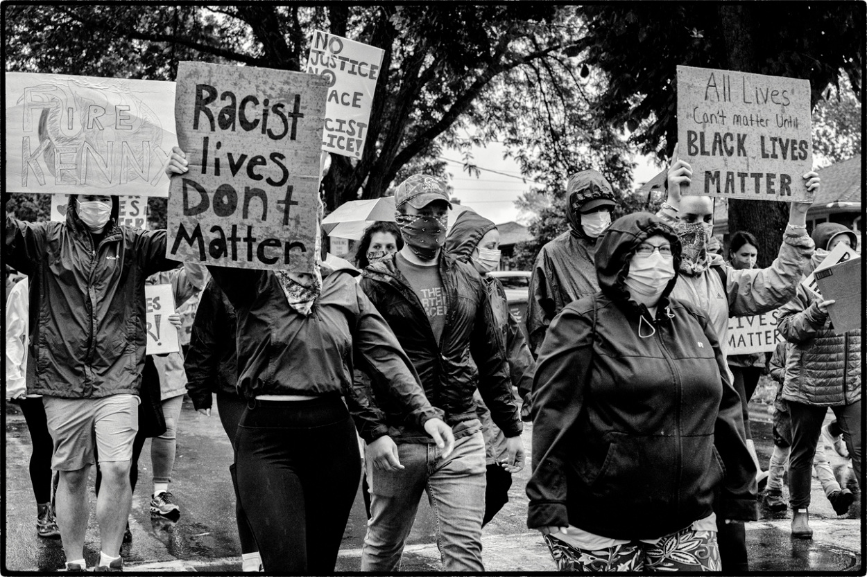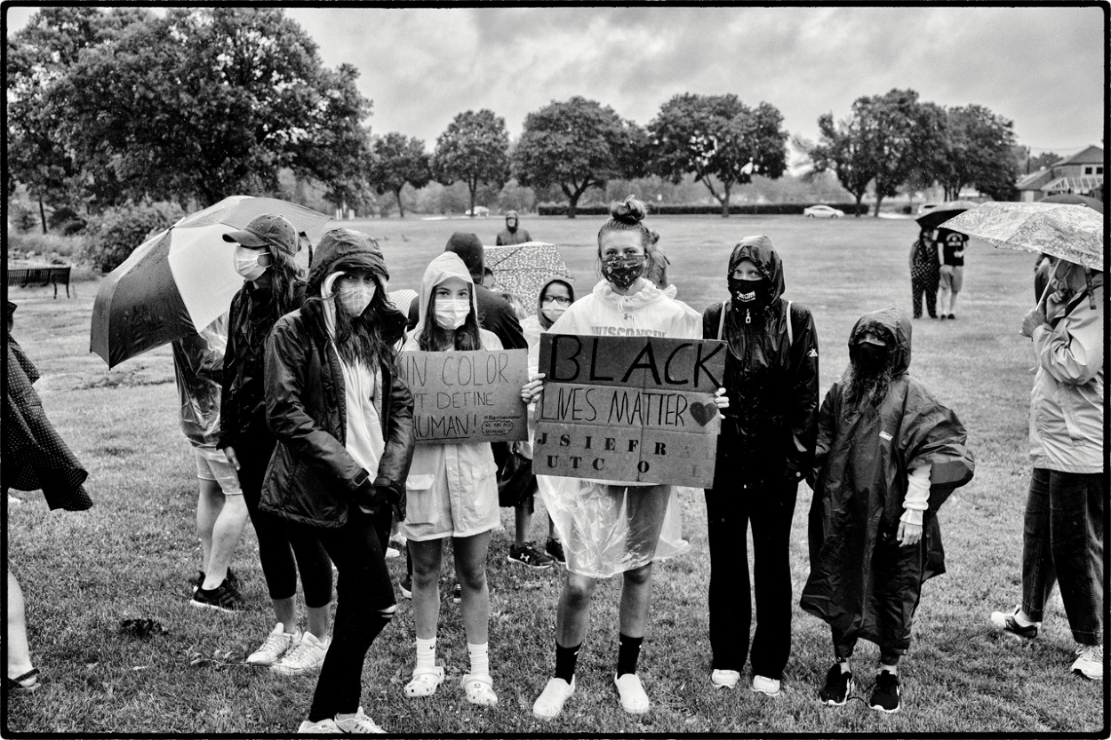 A post on Facebook earlier in the day said the protest walk was on rain or shine… Rain it was and walk they did! A crowd of several hundred gathered at the Monona Grove school district building and then proceeded to march down Nichols Road to Winnequah Park, where an eight minute 46 second moment of silence was held in remembrance of George Floyd and how long it took Derek Chauvin to murder Mr. Floyd on May 25th 2020 in Minneapolis, MN.