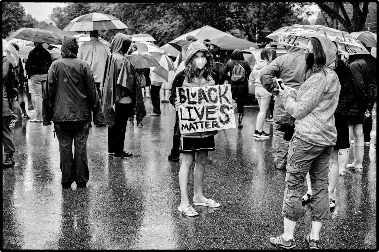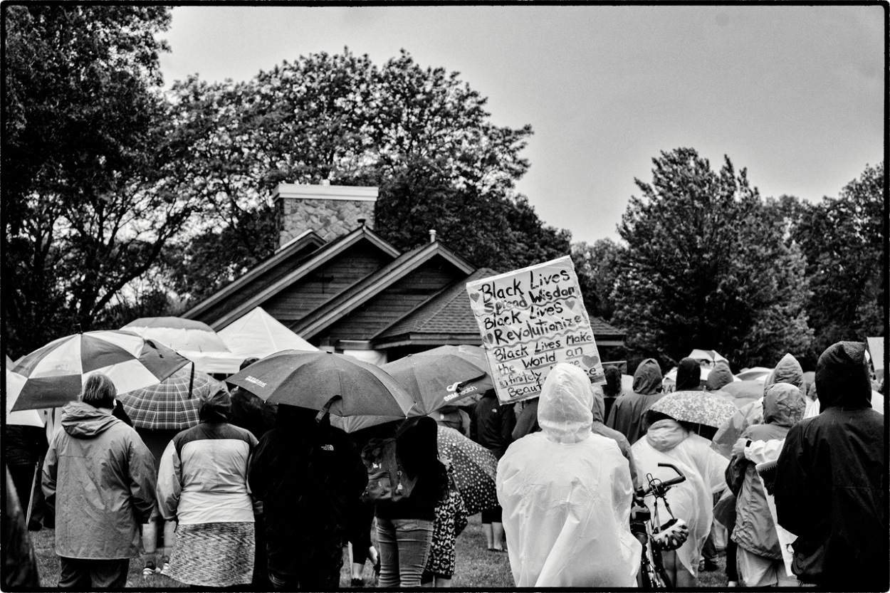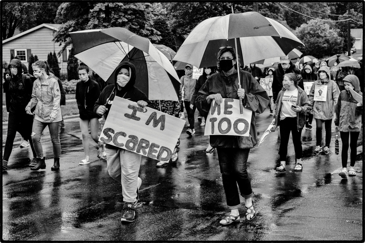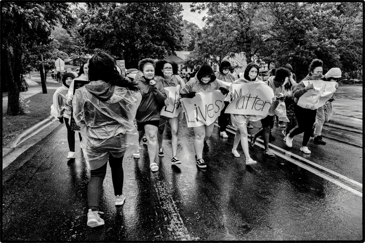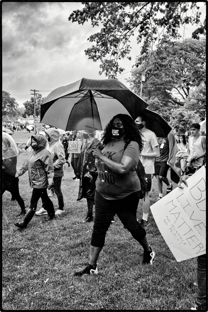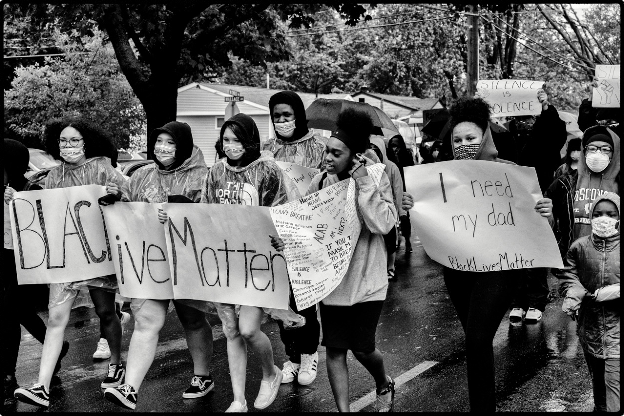 A post on Facebook earlier in the day said the protest walk was on rain or shine… Rain it was and walk they did! A crowd of several hundred gathered at the Monona Grove school district building and then proceeded to march down Nichols Road to Winnequah Park, where an eight minute 46 second moment of silence was held in remembrance of George Floyd and how long it took Derek Chauvin to murder Mr. Floyd on May 25th 2020 in Minneapolis, MN.