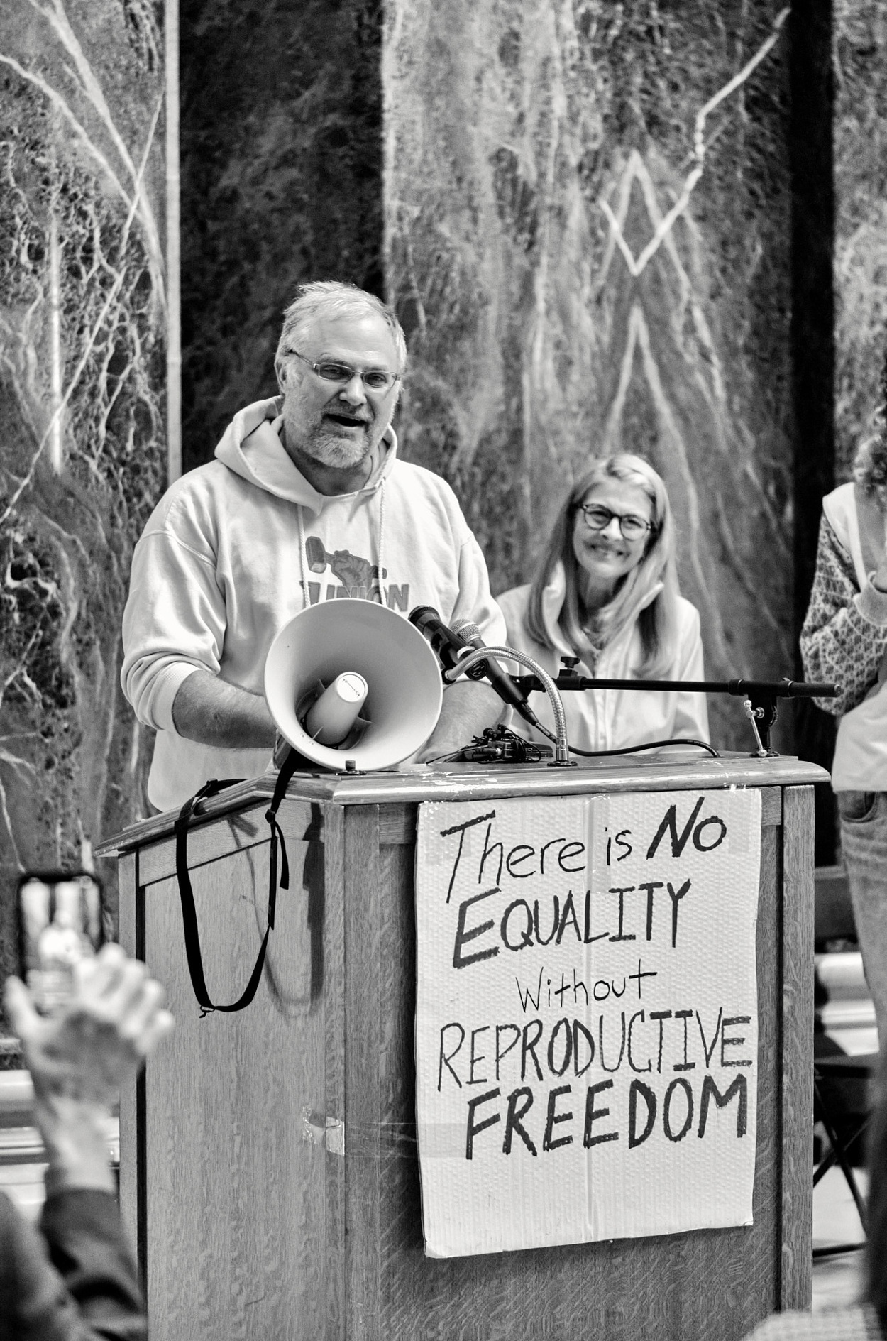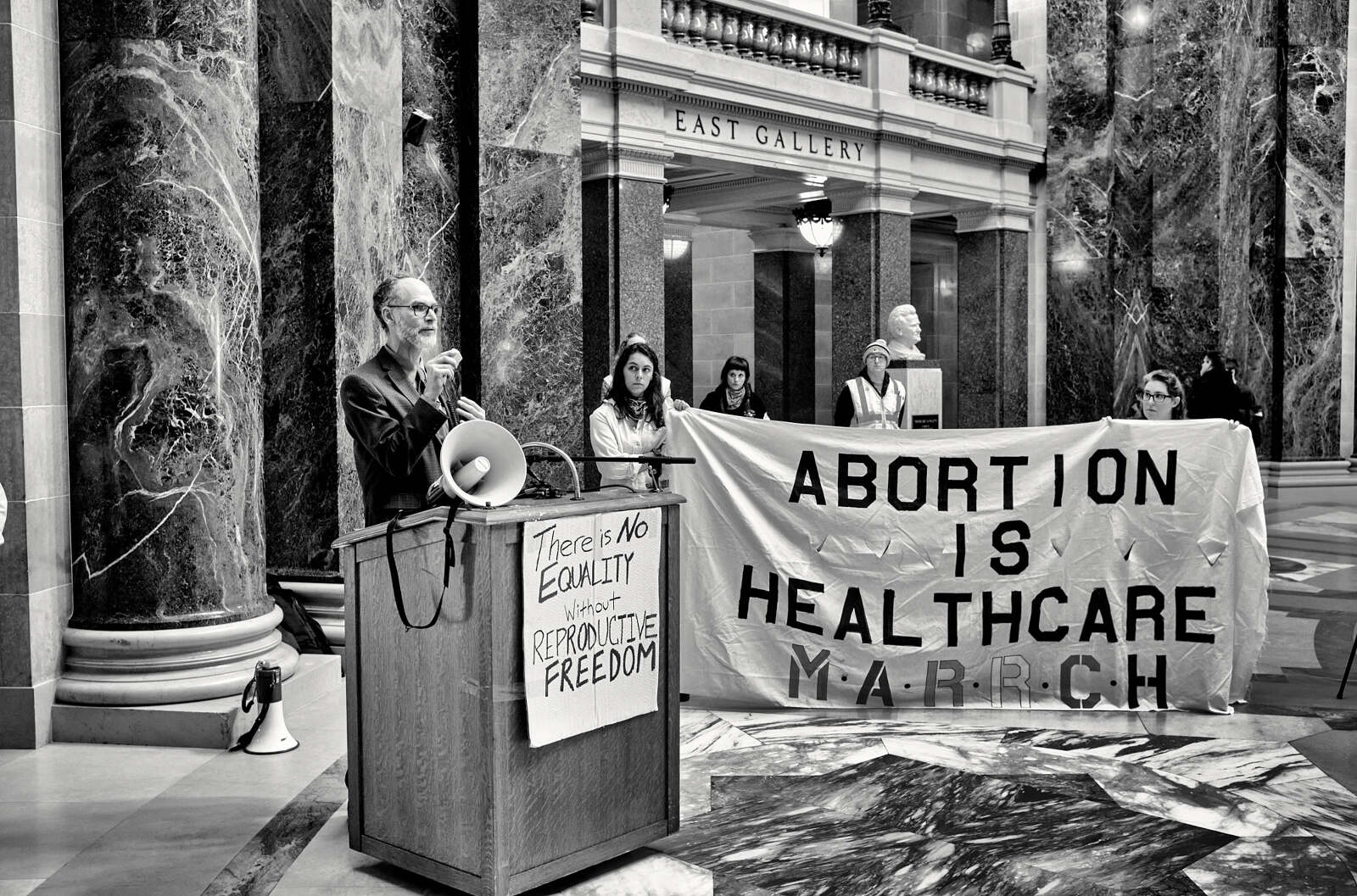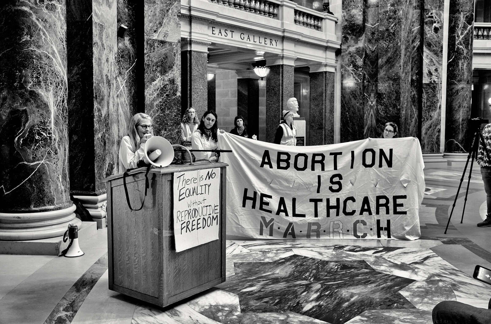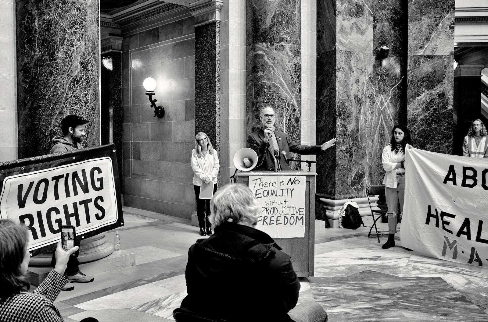 A small but committed group came out to support Madison Abortion & Reproductive Rights Coalition for Healthcare (MARRCH) as they delivered a press conference to highlight the importance of the upcoming spring primary Tuesday, February 21, 2023.