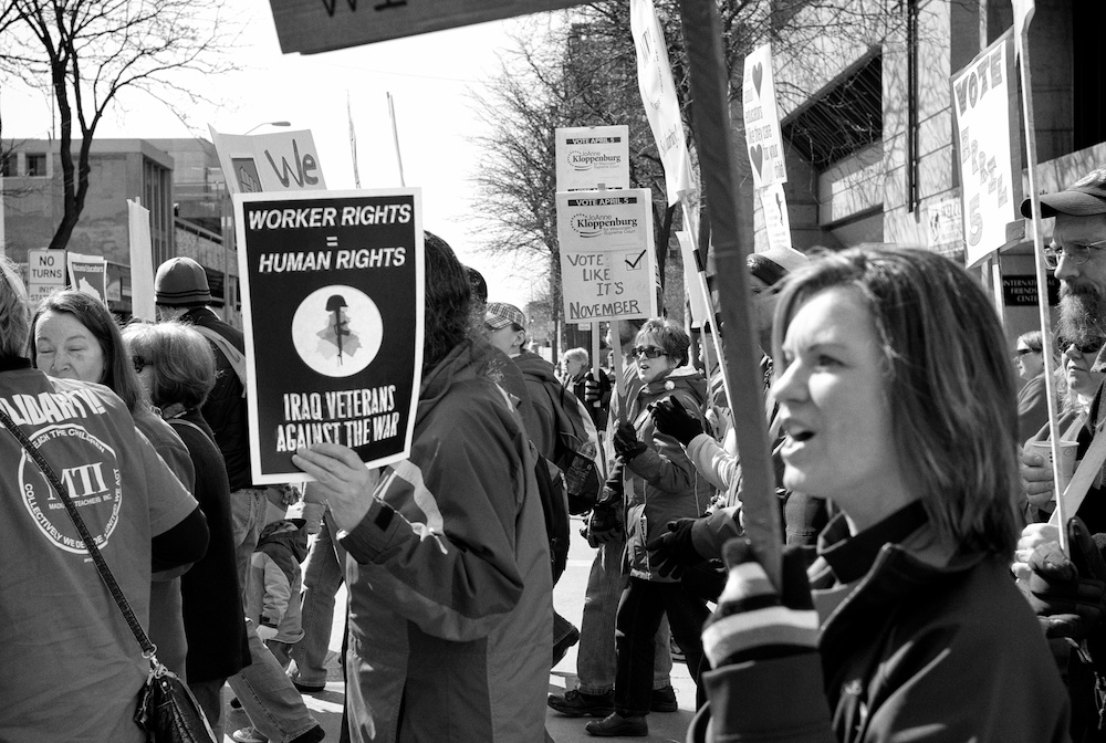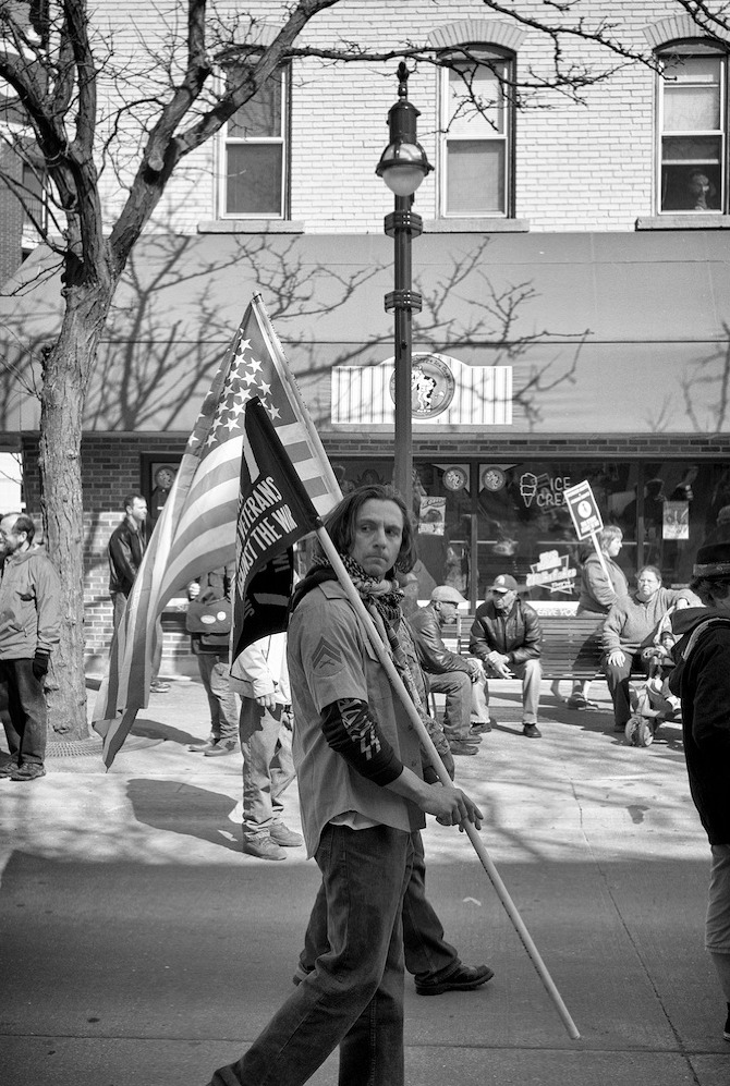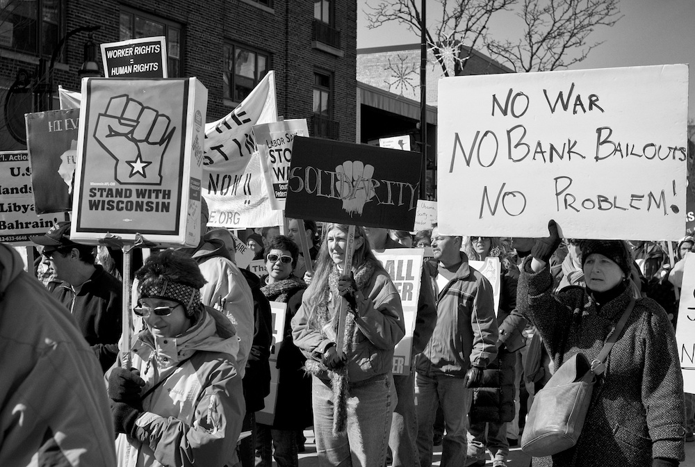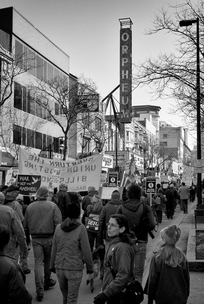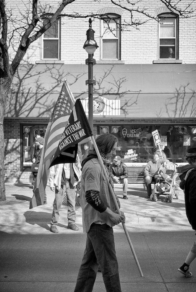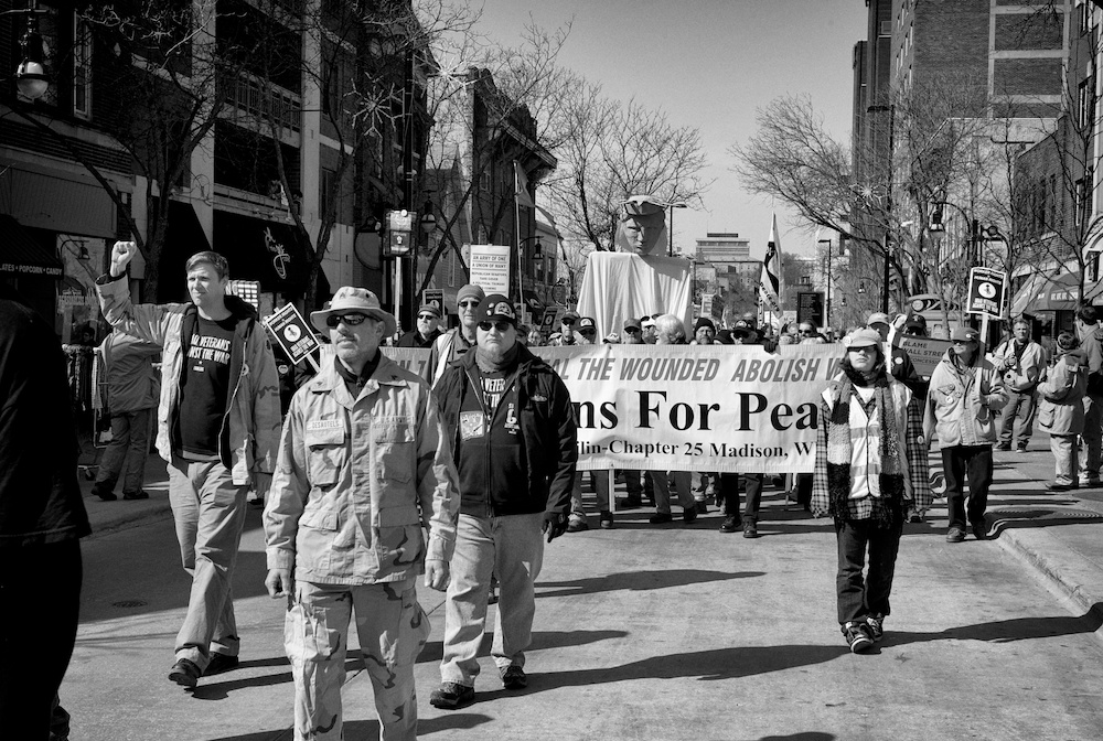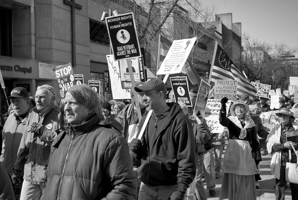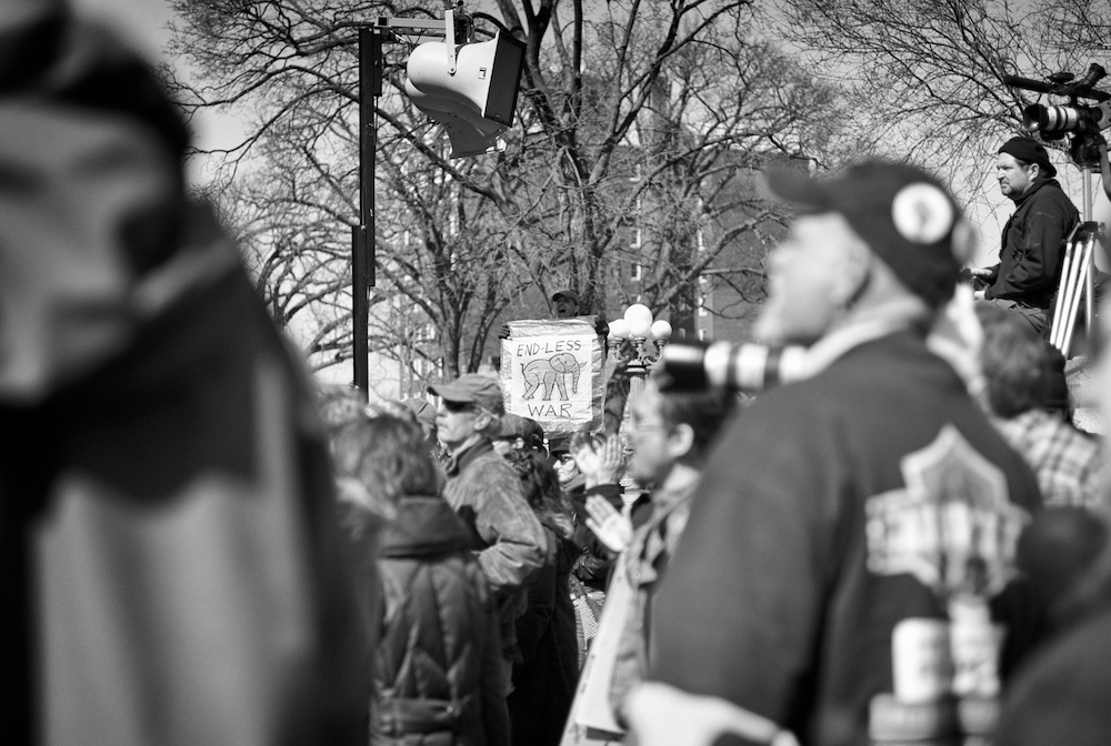 A protest rally and march against war. People gathered at UW-Madison Library Mall and marched up State Street to the Wisconsin State Capital.