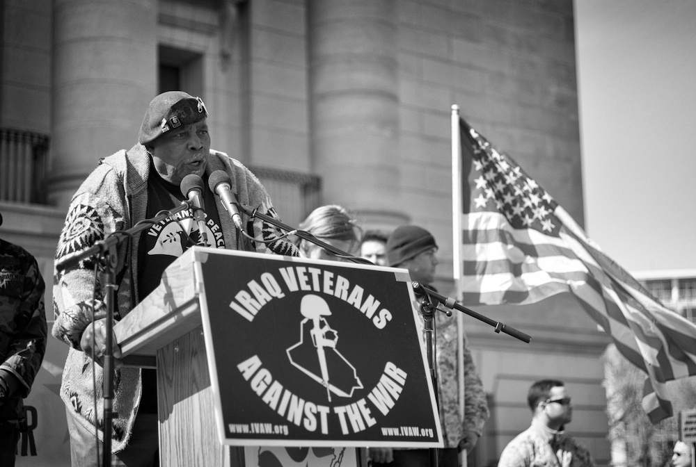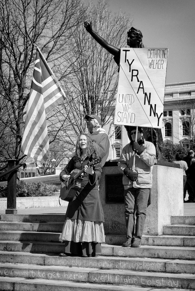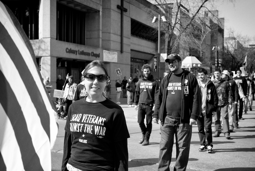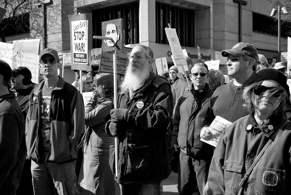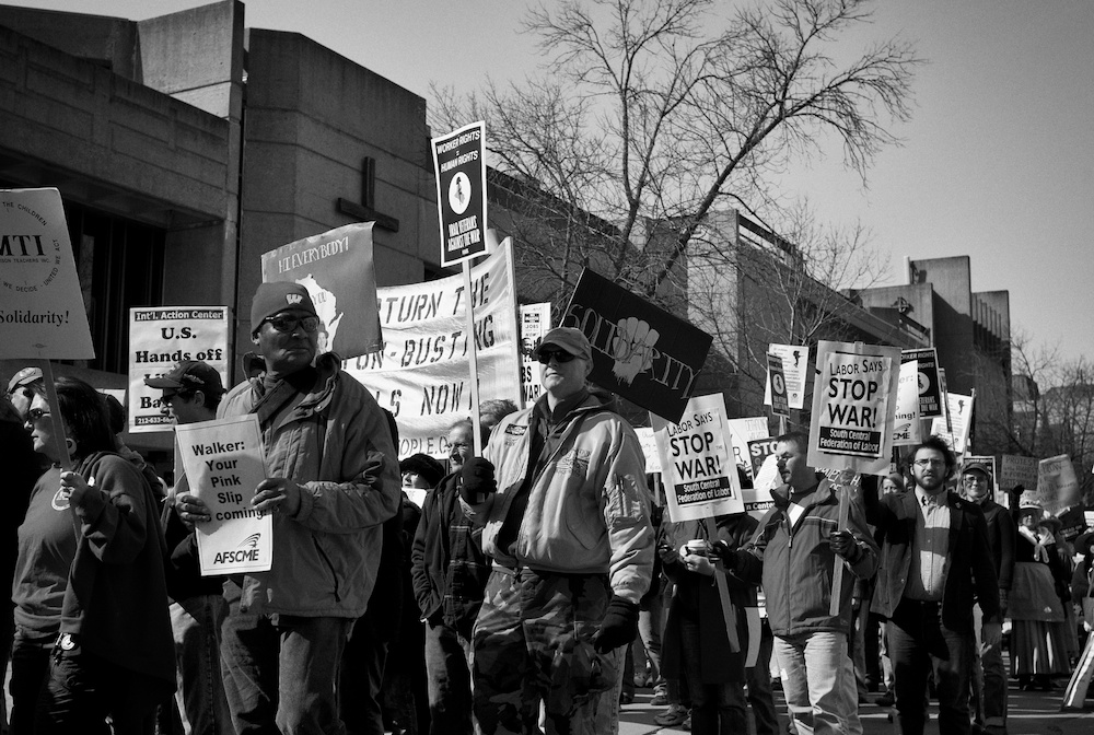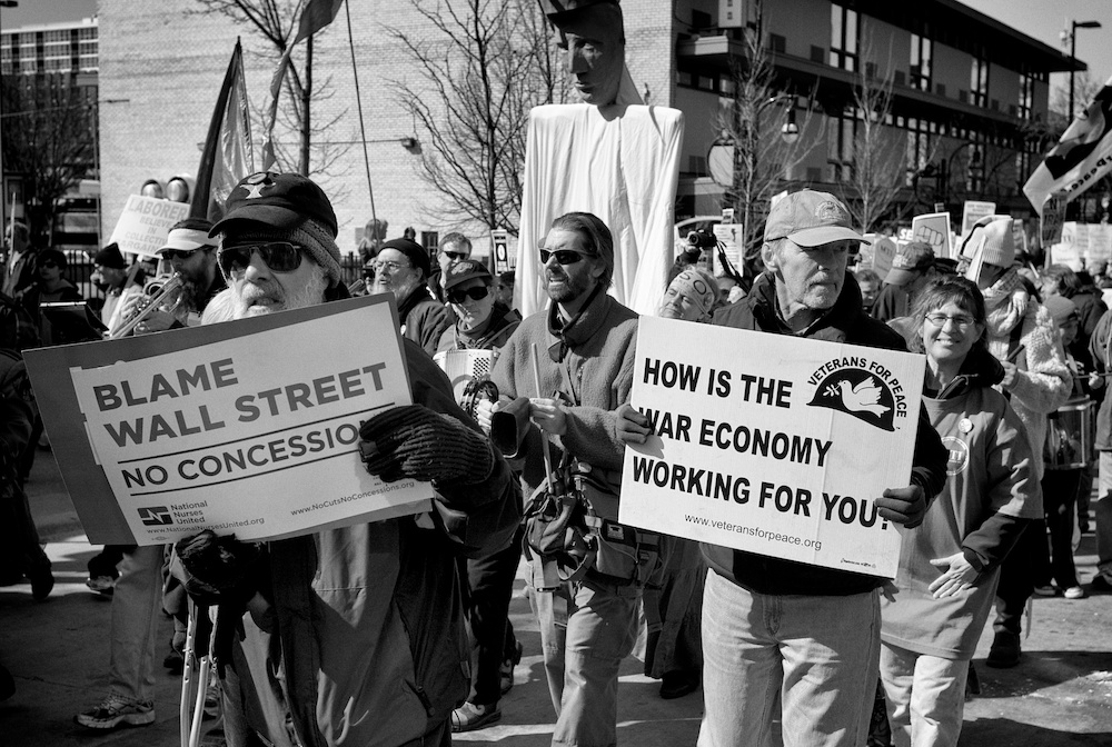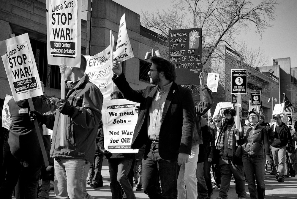 A protest rally and march against war. People gathered at UW-Madison Library Mall and marched up State Street to the Wisconsin State Capital.